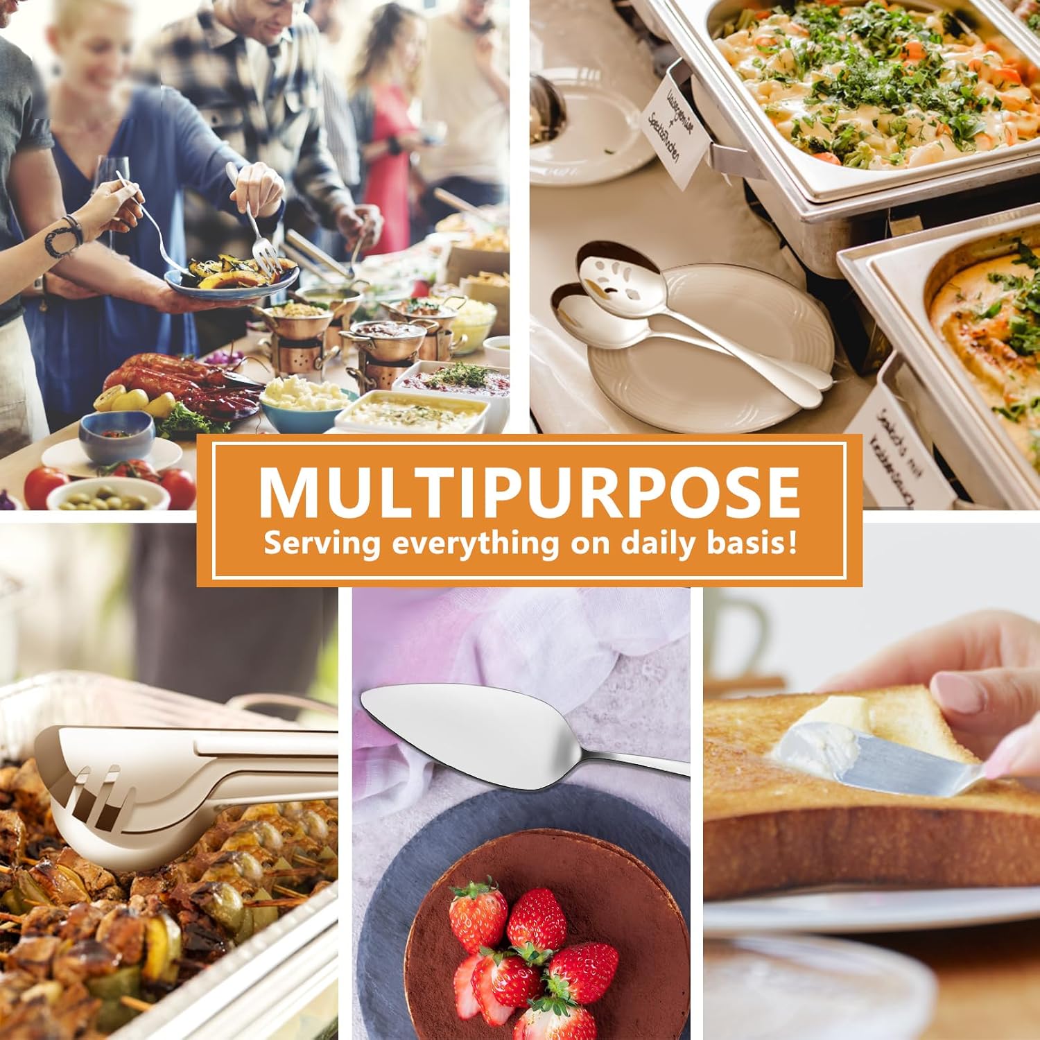 • 【Nice Buffet Serving Set】These metal serving utensils will be very suitable for serving food, distributing solid food, picking up food, filtering food, spreading butter and jam. The classic and elegant design makes this serving utensil set perfect for most dining occasions, providing you with a cozy and enjoyable dining atmosphere