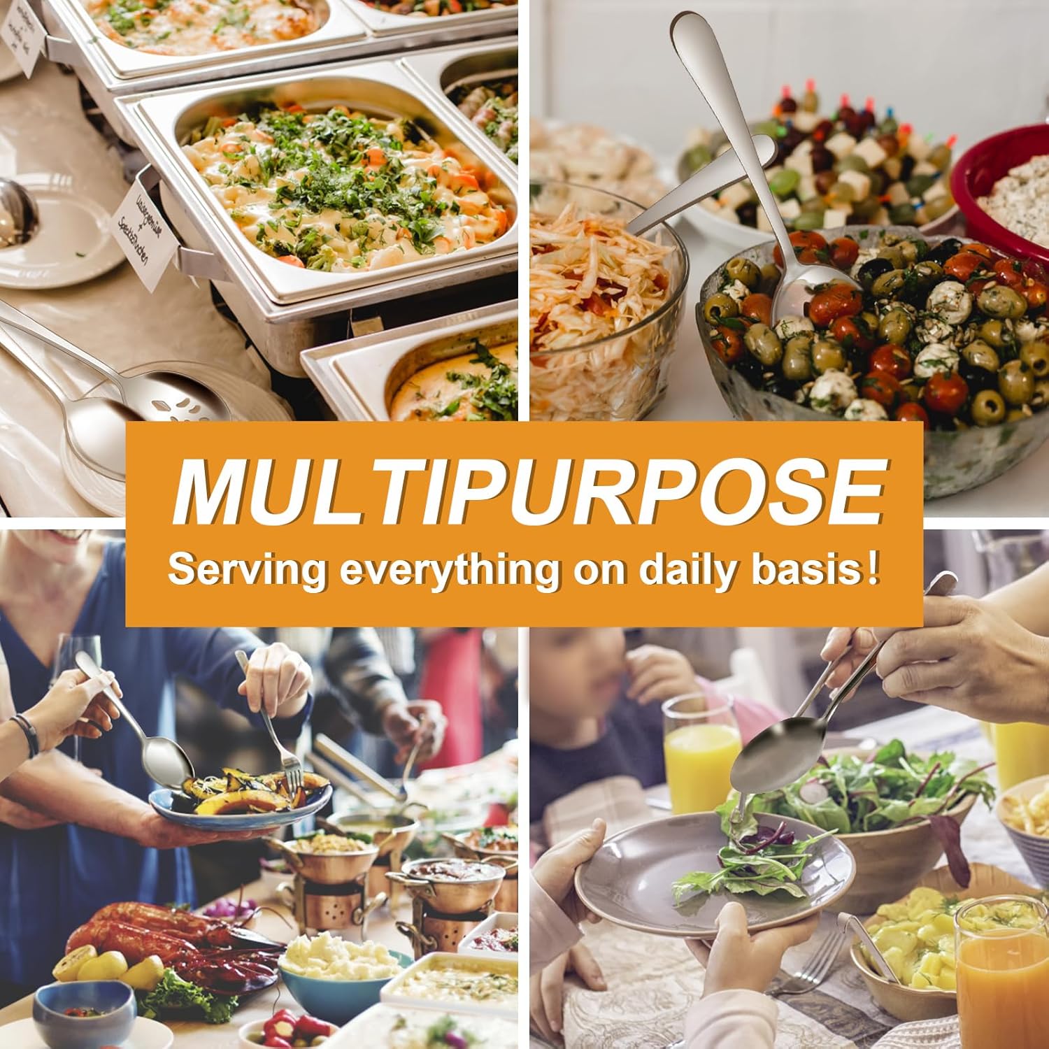 • 【High Quality & Durable】These serving utensils adopts a strong structure, made of food-grade stainless steel that the serving spoons are solid, corrosion-resistant, rust-resistant, no smell,no bending. Ensuring you enjoy the food safely and provide you with a durable serving spoon set that can be used for many years. What's more, these spoons are dishwasher safe