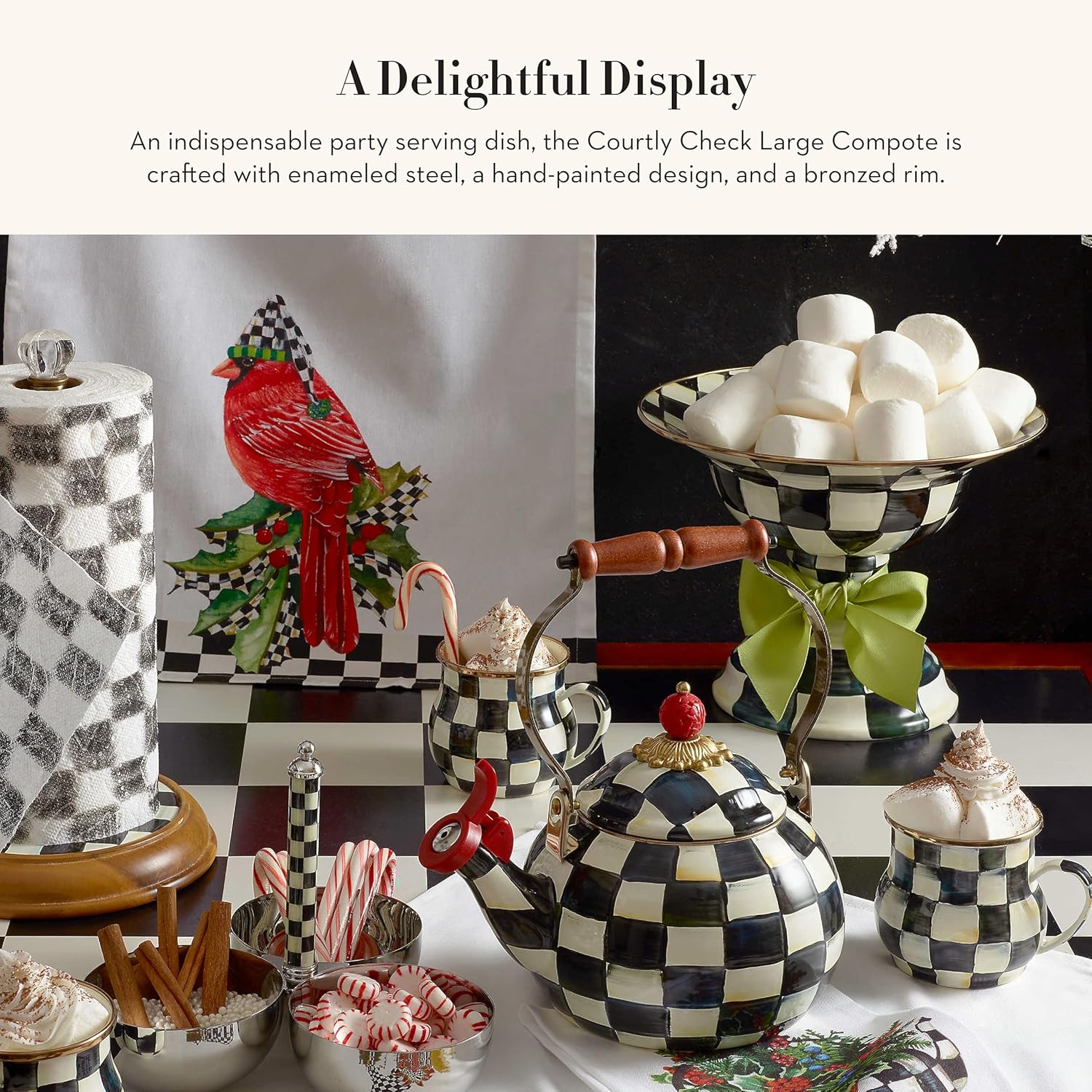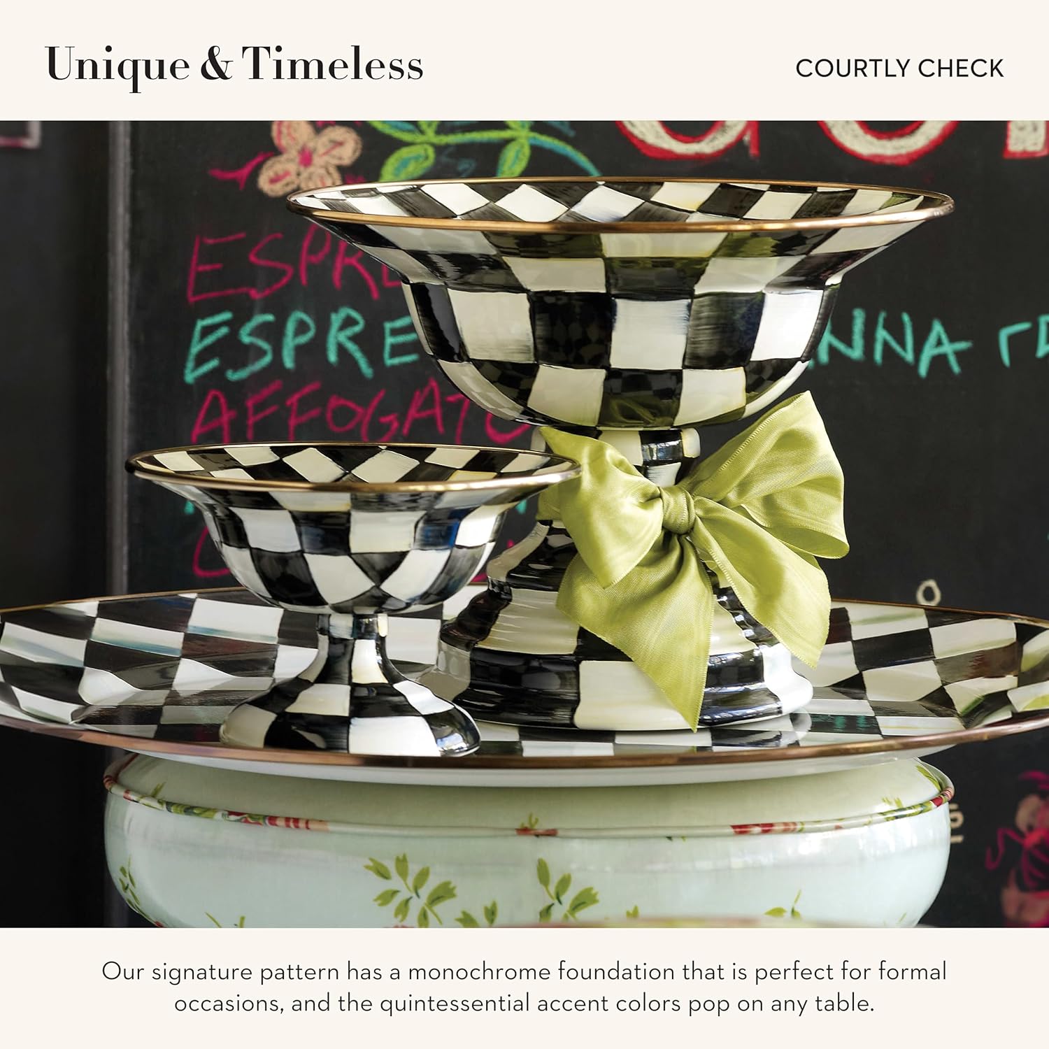 • ELEGANT SERVING ESSENTIAL: Great for serving and entertaining, the Courtly Check Enamel Compote is an elegant pedestal bowl for any dining table. It features hand-painted black-and-white checks over a steel underbody and has a stainless-steel rim.