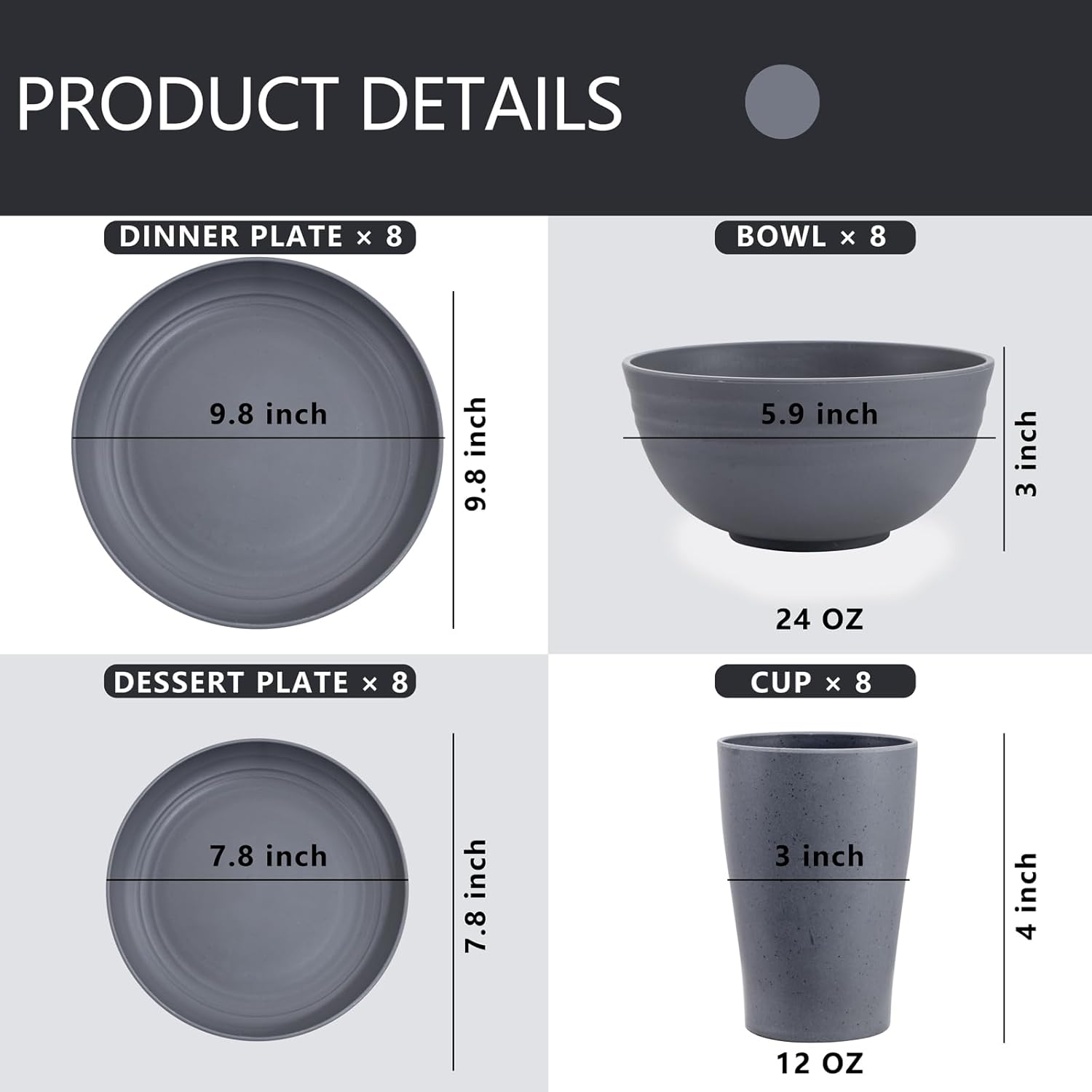 Supernal 32pcs Wheat Straw Dinnerware Sets,Unbreakable Dinnerware Sets for 8,Reusable Tableware,Dishes Set for 8,Plates and Bowls Set Dark Grey Include16pcs Plates, 8pcs Bowls, 8pcs Cups