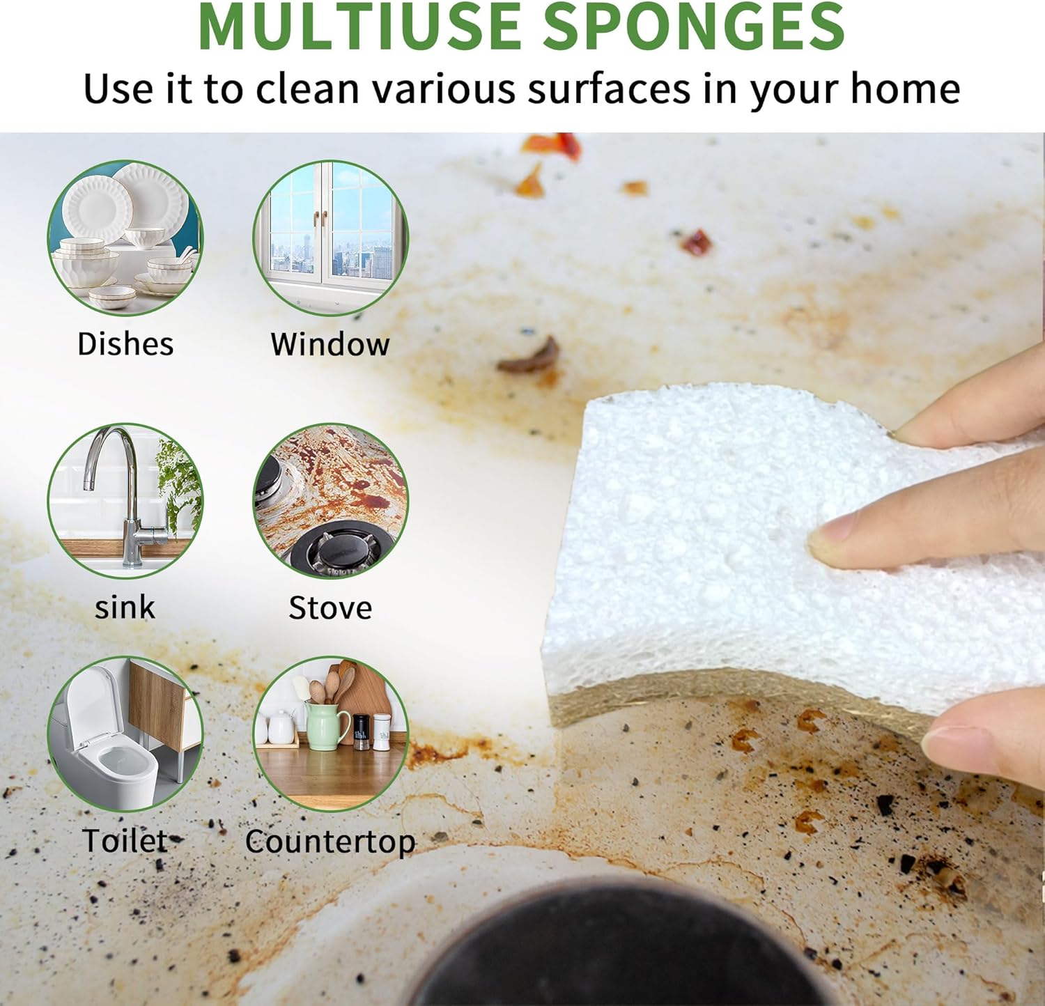 • NON-SCRATCH MULTIPURPOSE SPONGES: Safely scrub your dishes and even delicate surfaces without worrying about unwanted scratching. This eco kitchen sponge can help you gently yet effortlessly wipe away grease, dirt, grime, and other impurities, keep your kitchen and bathroom sparkling clean.Premium scrubbing side cleans without scratch, safe to be used on non-stick cookware, the non-abrasive white cellulose sponge wipes away dirt and particles, can be used with dishwashing liquid if preferred