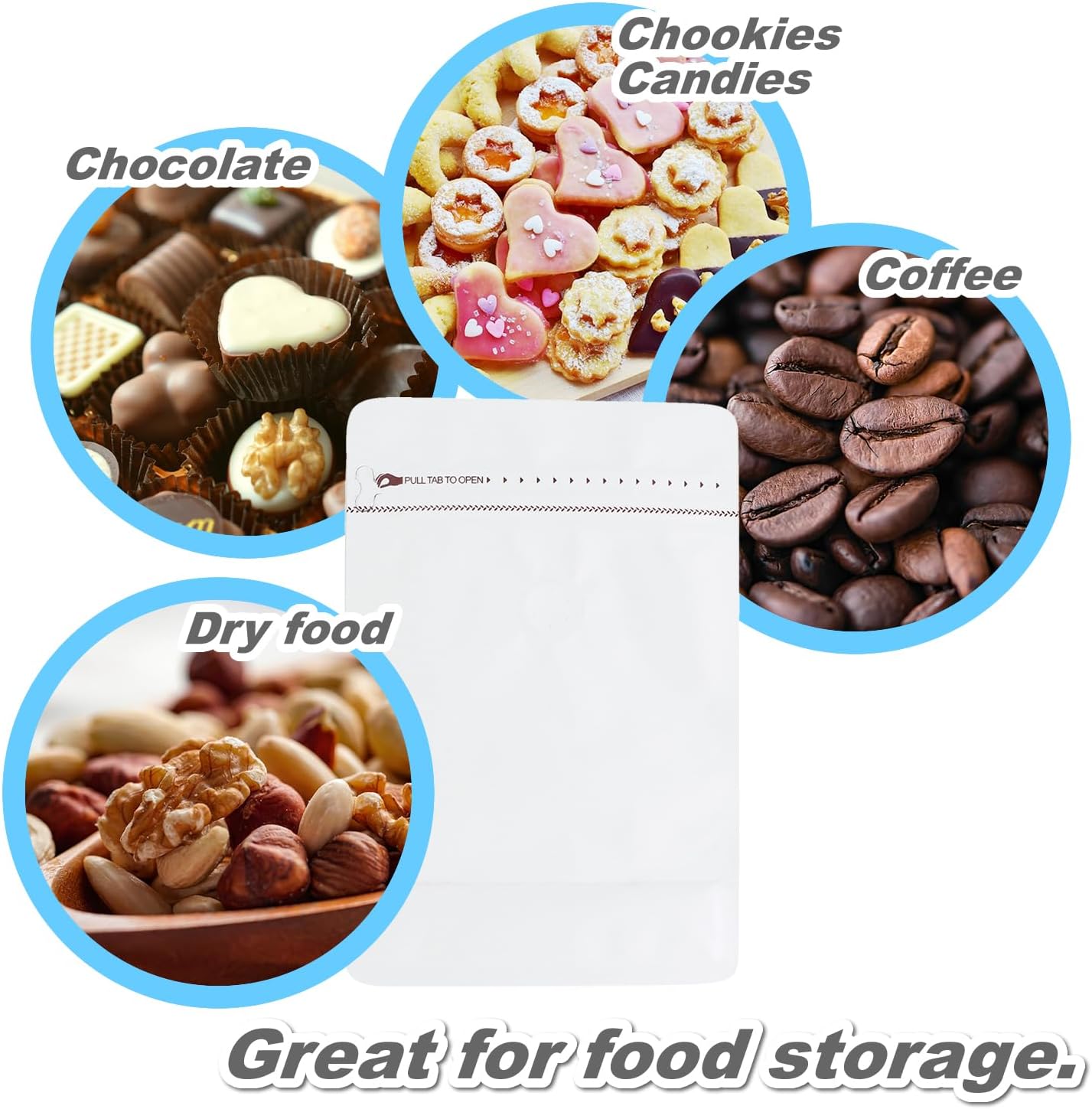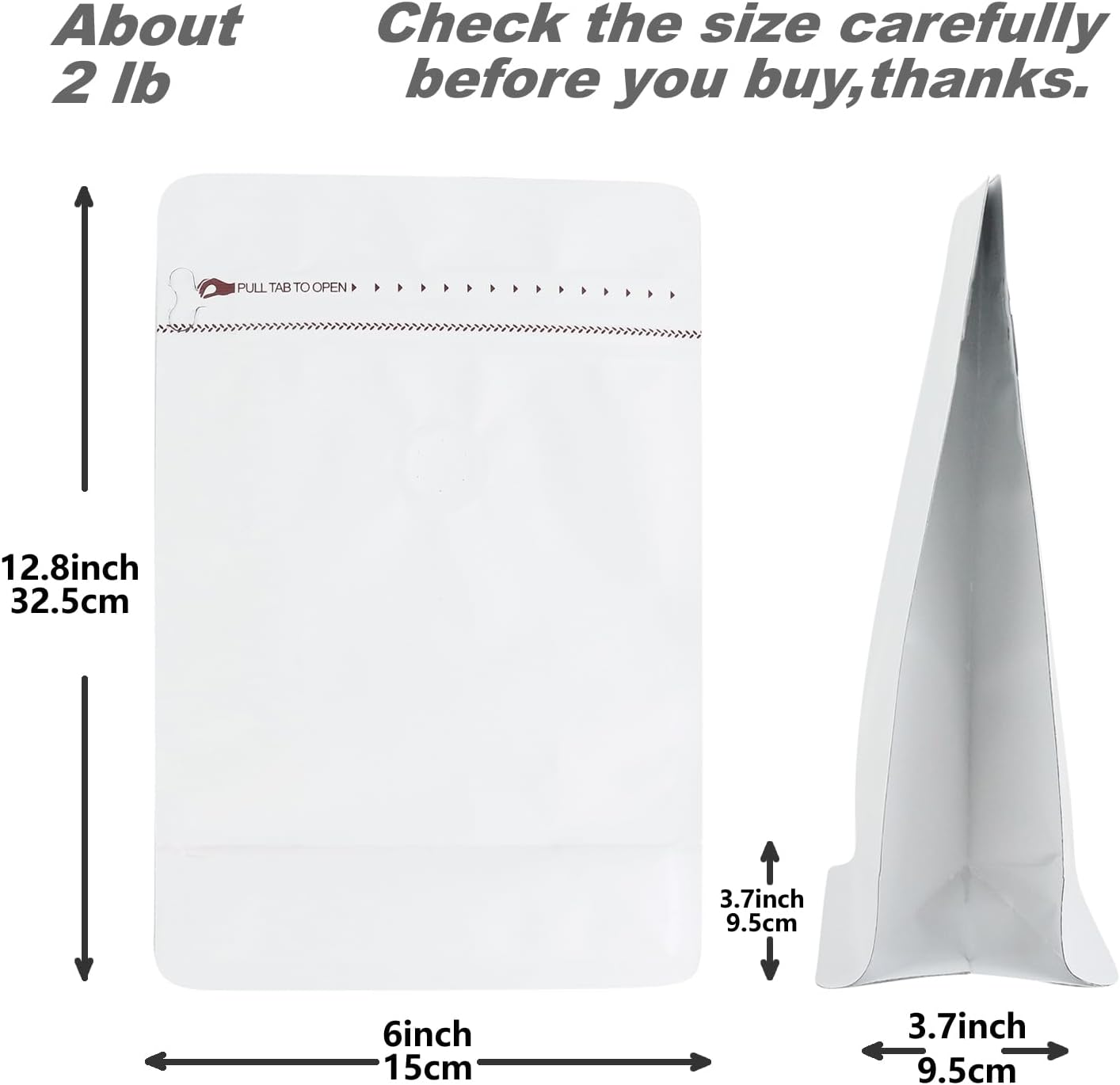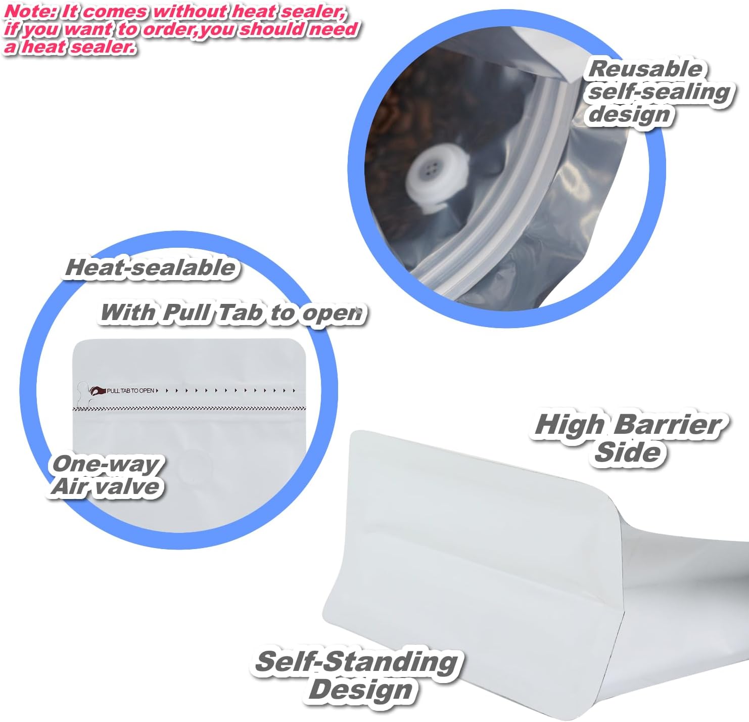 150 Pack High Barrier Stand-Up Coffee Bean Bags with Vented Valve, Matte Metallic, Heat-Sealable and Resealable Solid Color Pouches for Food Storage (6 * 12.8 inch,2 lb,32 oz,White)