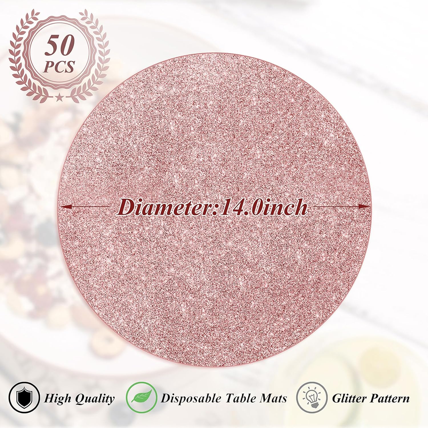 • What you get: 50 pieces of rose gold glitter paper placemats in the diameter of 14 inch, sufficient quantities and bling bling effect that can meet your various dining table decoration needs