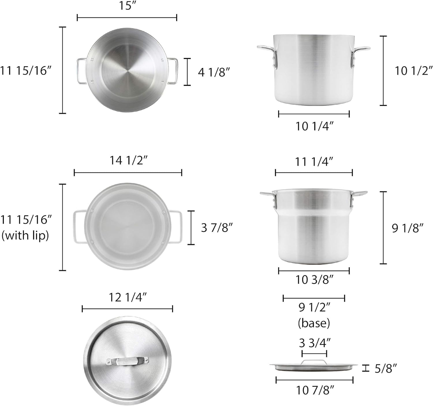 • Measures 16 qt, Outer Pot: 11-3/8" Diameter x 10-1/4" Height, 1-3/4" Handle, Middle Pot: 10-3/8" Diameter x 9-1/4" Height, Lid: 12-1/4" Diameter x 5/8" Height, Double Boiler , Aluminum, Heavy Gauge, Dishwasher Safe, Standard Electric, Gas Cooktop, Halogen Ready, Mirror-Finish, NSF