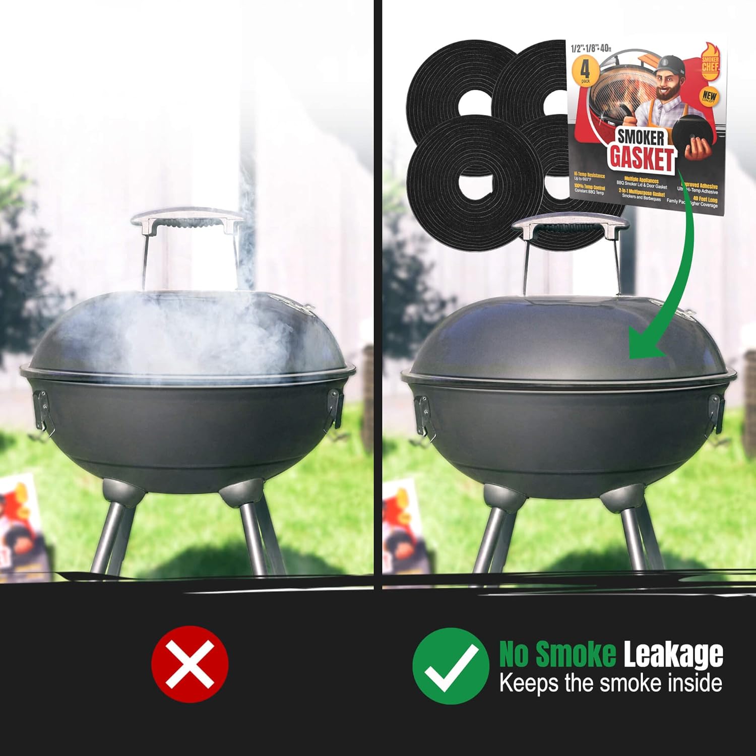 • ✔️[ HIGH PERFORMANCE GASKET ] Get your Smoker Chef HI Temp BBQ Gasket right now and boost the performance of your grill / smoker. Our fire tape for grill is made out of premium fireproof (fire resistant) high temp gasket material, designed to endure a high temperature, up to 660F. Due to the high-quality adhesive tape, the gasket will instantly stick to the grill and its lid ensuring a long-term strong seal. It prevents any smoke leakage and will maintain a constant temperature inside the grill.