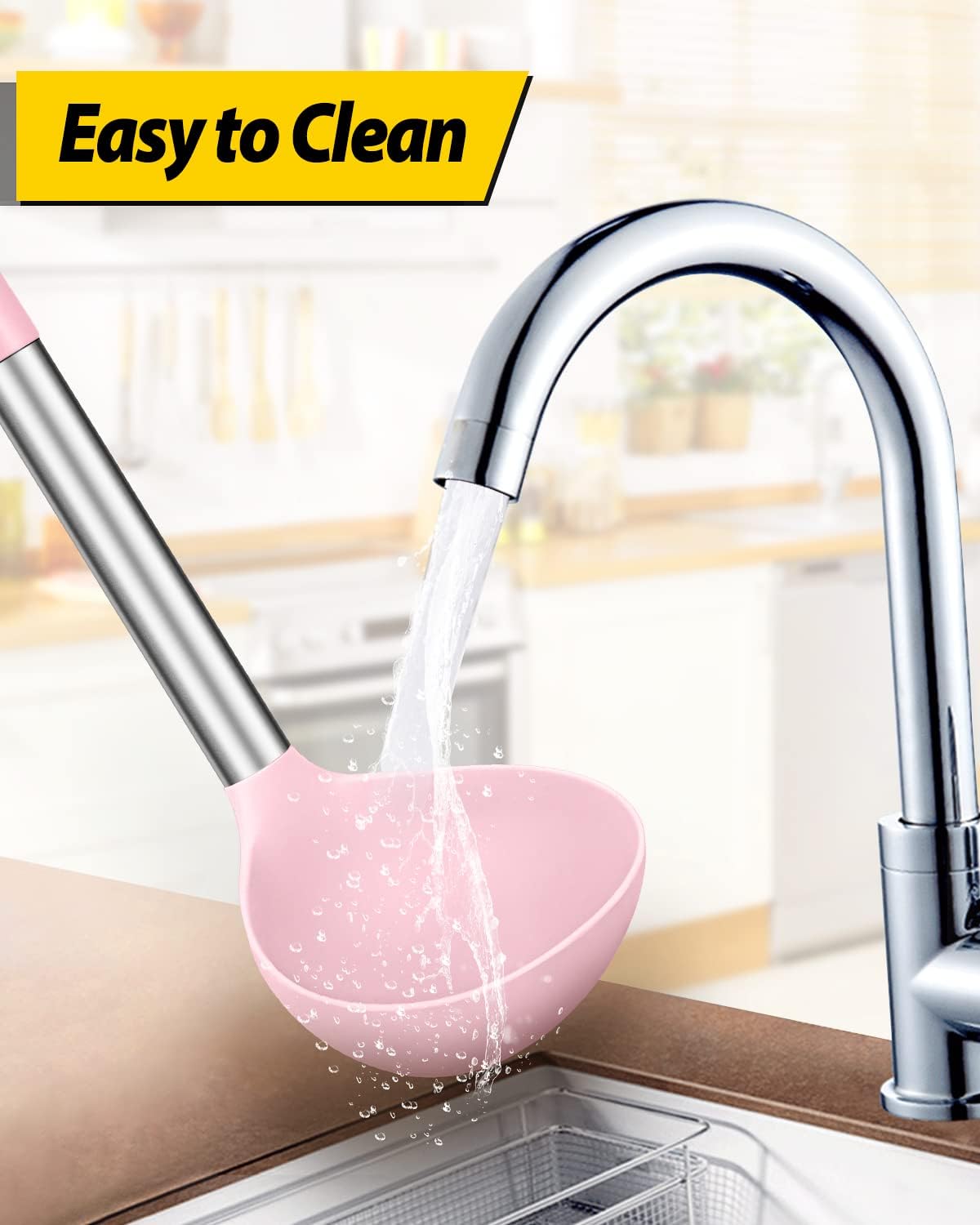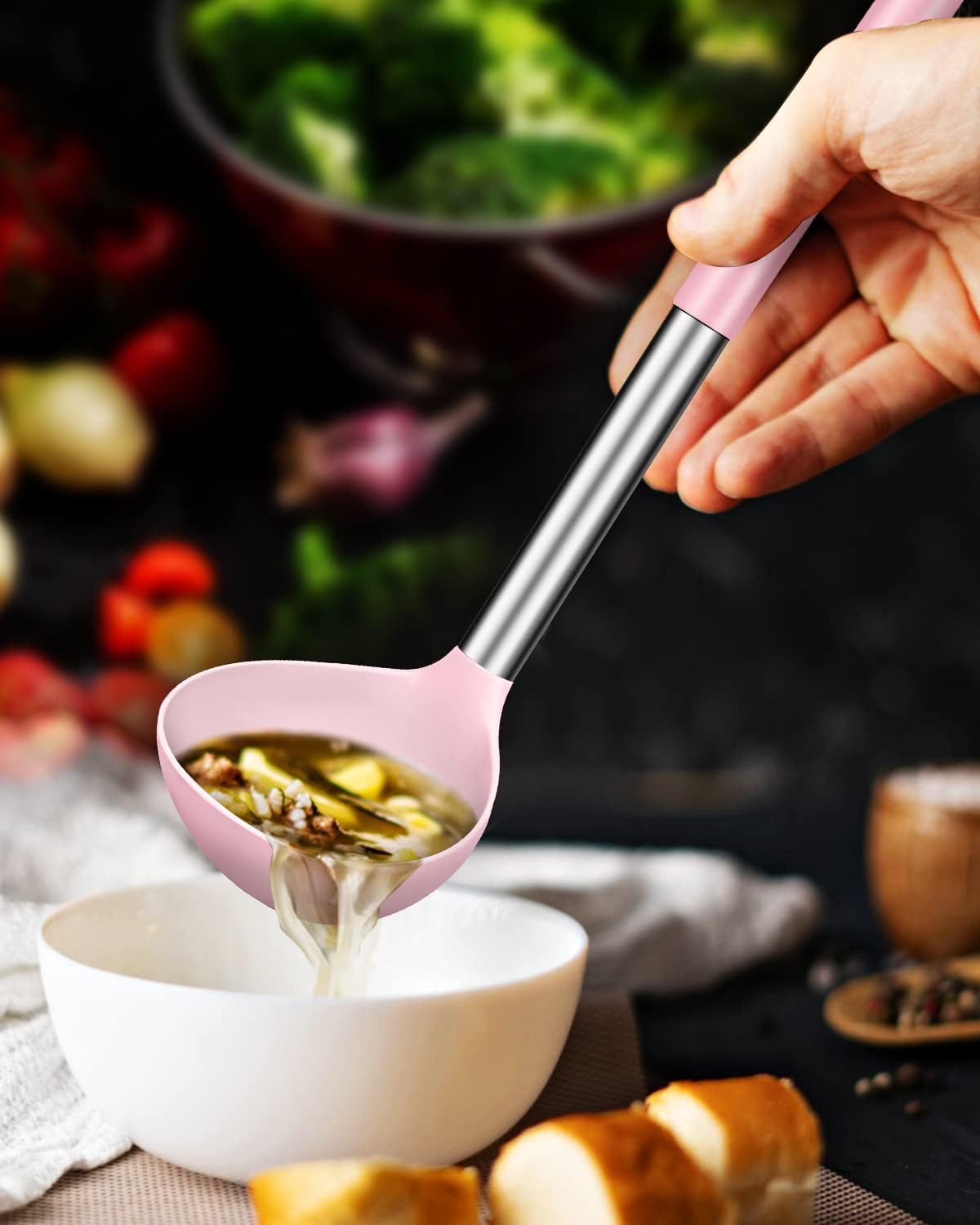 • More Safe and Healthy : Our kitchen ladle spoons are made of food-grade silicone, free of BPA;Even at high temperatures, there is no need to worry about melting or deforming;And the soft silicone head won't scratch the coating, it can better protect your pot
