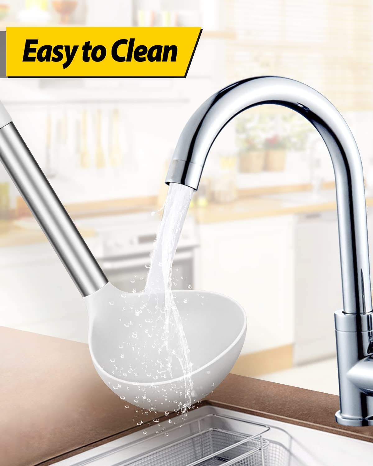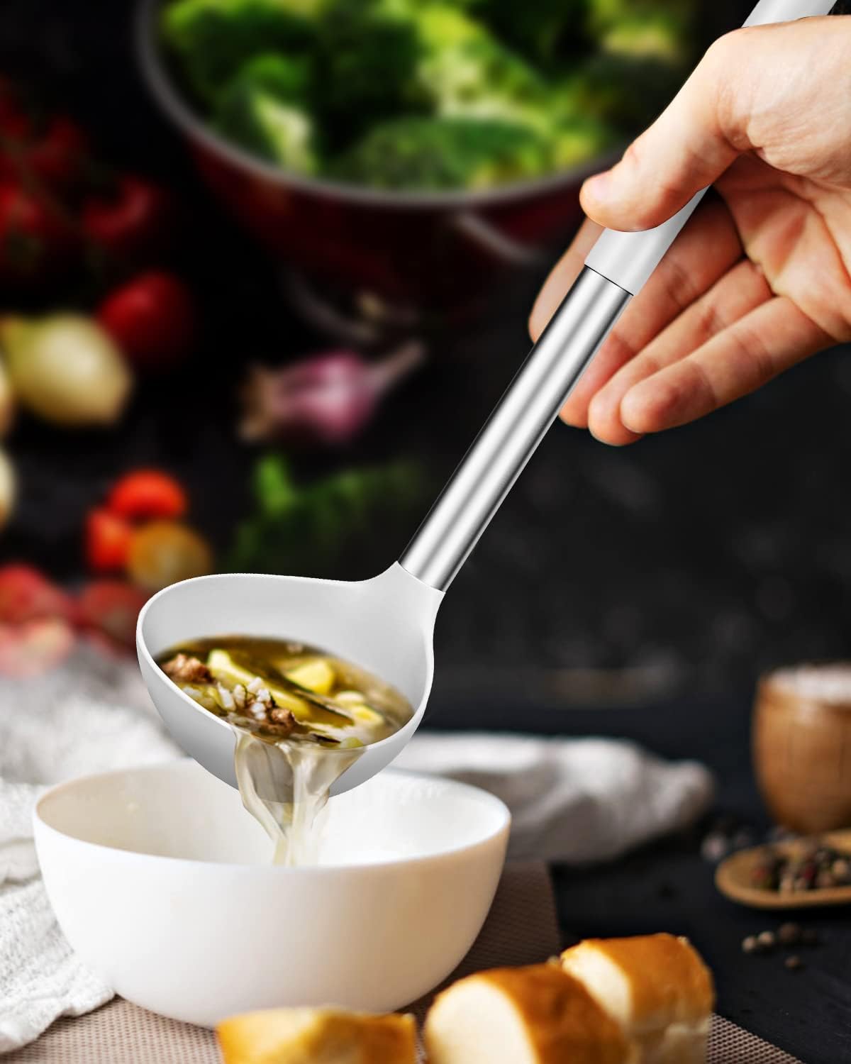 • More Safe and Healthy : Our kitchen ladle spoons are made of food-grade silicone, free of BPA;Even at high temperatures, there is no need to worry about melting or deforming;And the soft silicone head won't scratch the coating, it can better protect your pot
