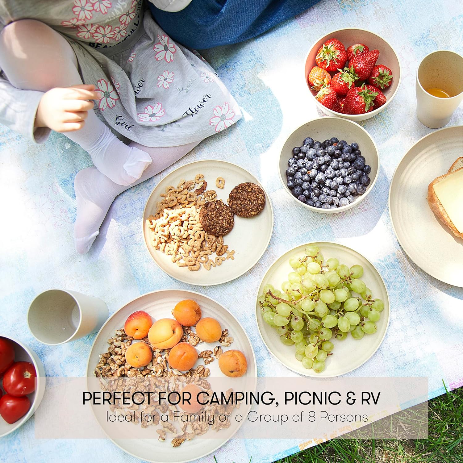• Multipurpose Dinnerware - Our reusable dishes set for 8 are made for every occasion and will not only be great for home and kitchen use, but also convenient for an rv or camper, a picnic, BBQing, camping, work, school and much more. The unique design allows for easy compact storage as well. You can't go wrong with our wheatstraw dinnerware set.