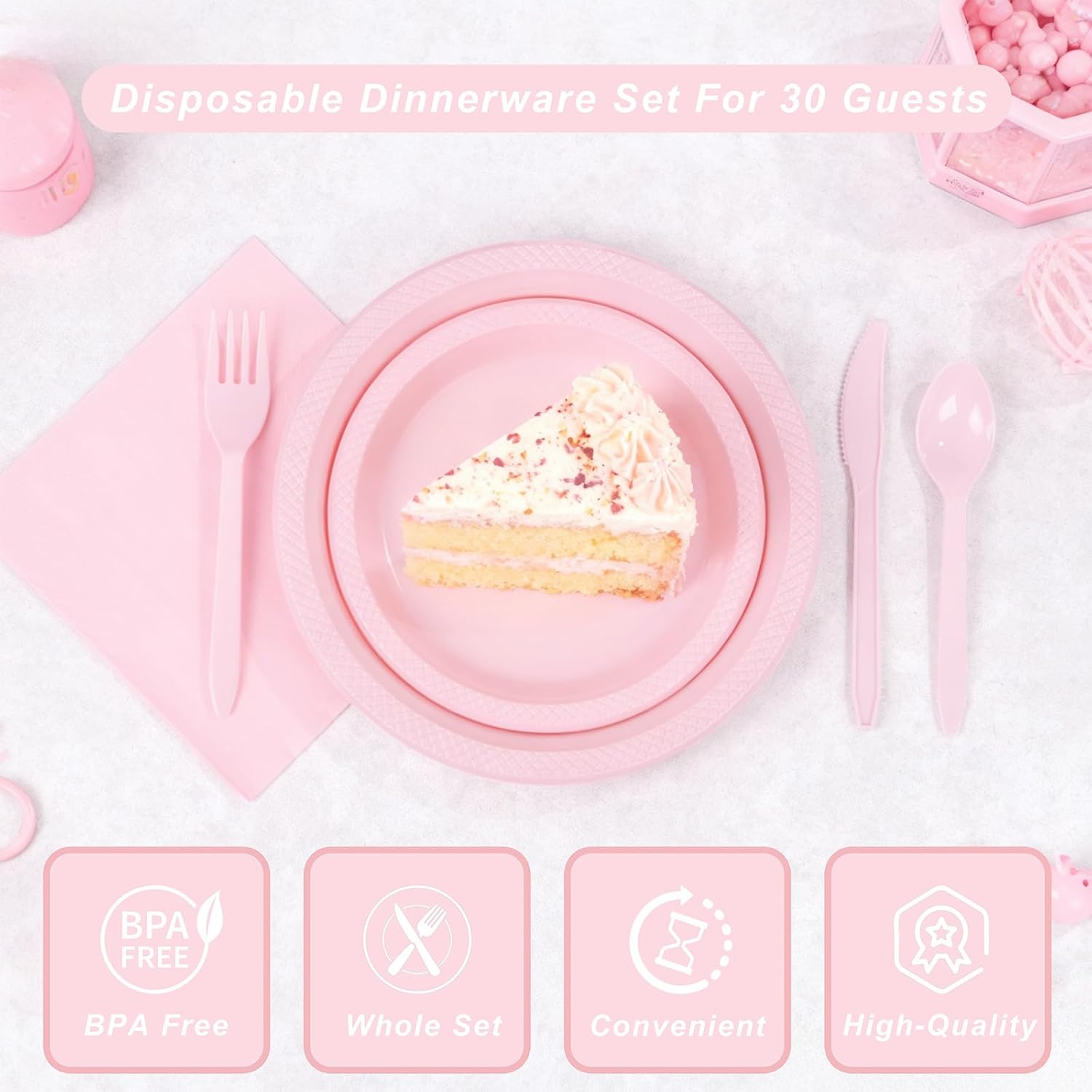 WELLIFE 210 Pieces Pink Party Supplies, Disposable Dinnerware Set, Including Pink Plastic Plates, 16OZ Cups, Plastic Cutlery and Napkins Serve 30 Guests for Party