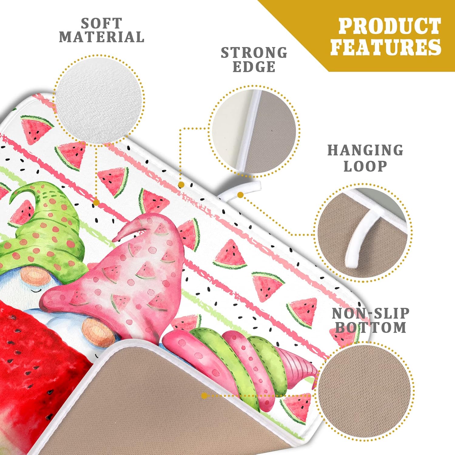 Kawani Gnomes Watermelon Dish Drying Mat for Kitchen Counter, Summer Watercolor Fruit Buffalo Check Quick Dry Absorbent Dishes Draining Mats Reversible Drainer Rack Pad 16 x 18