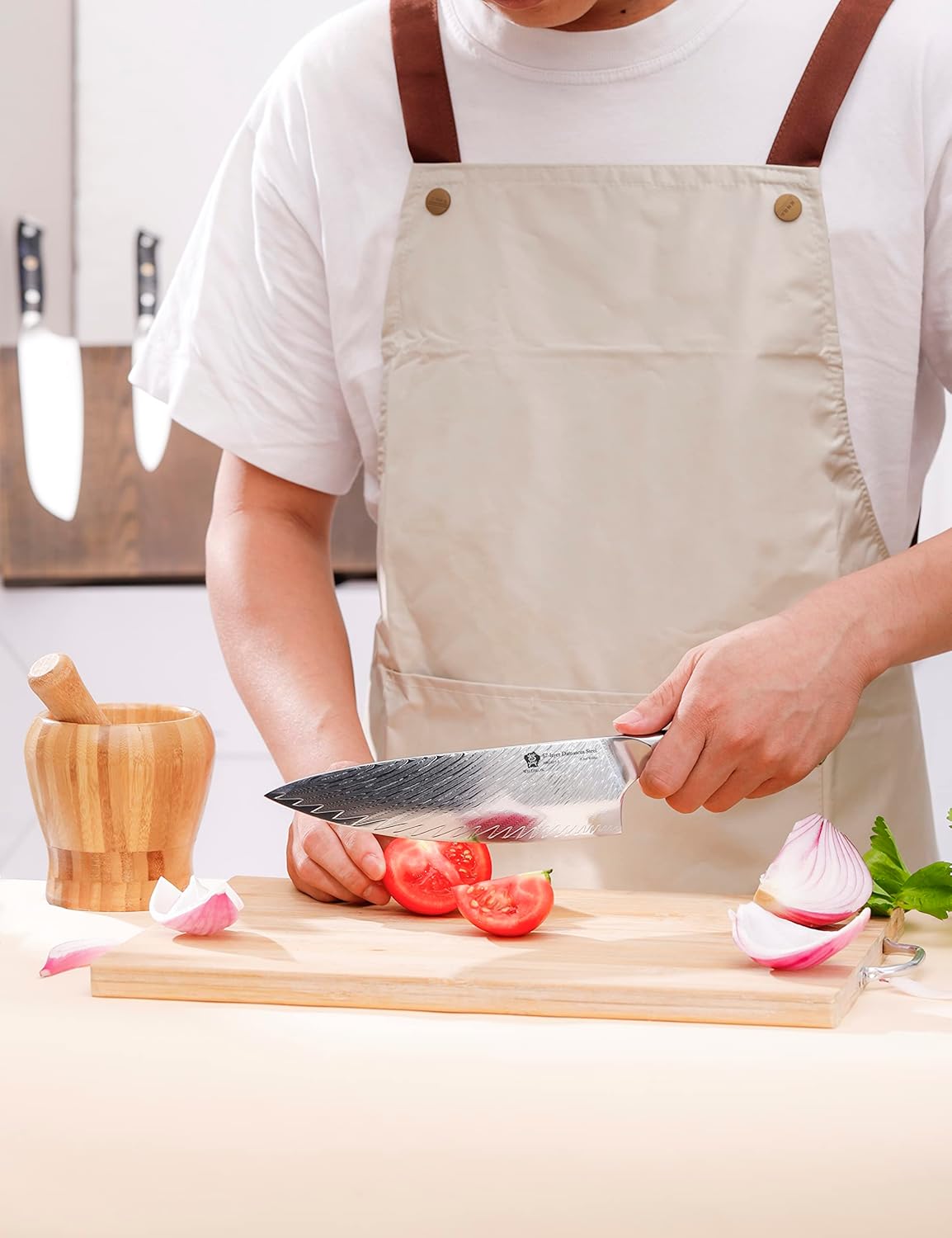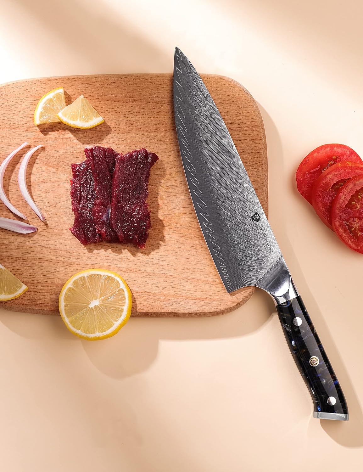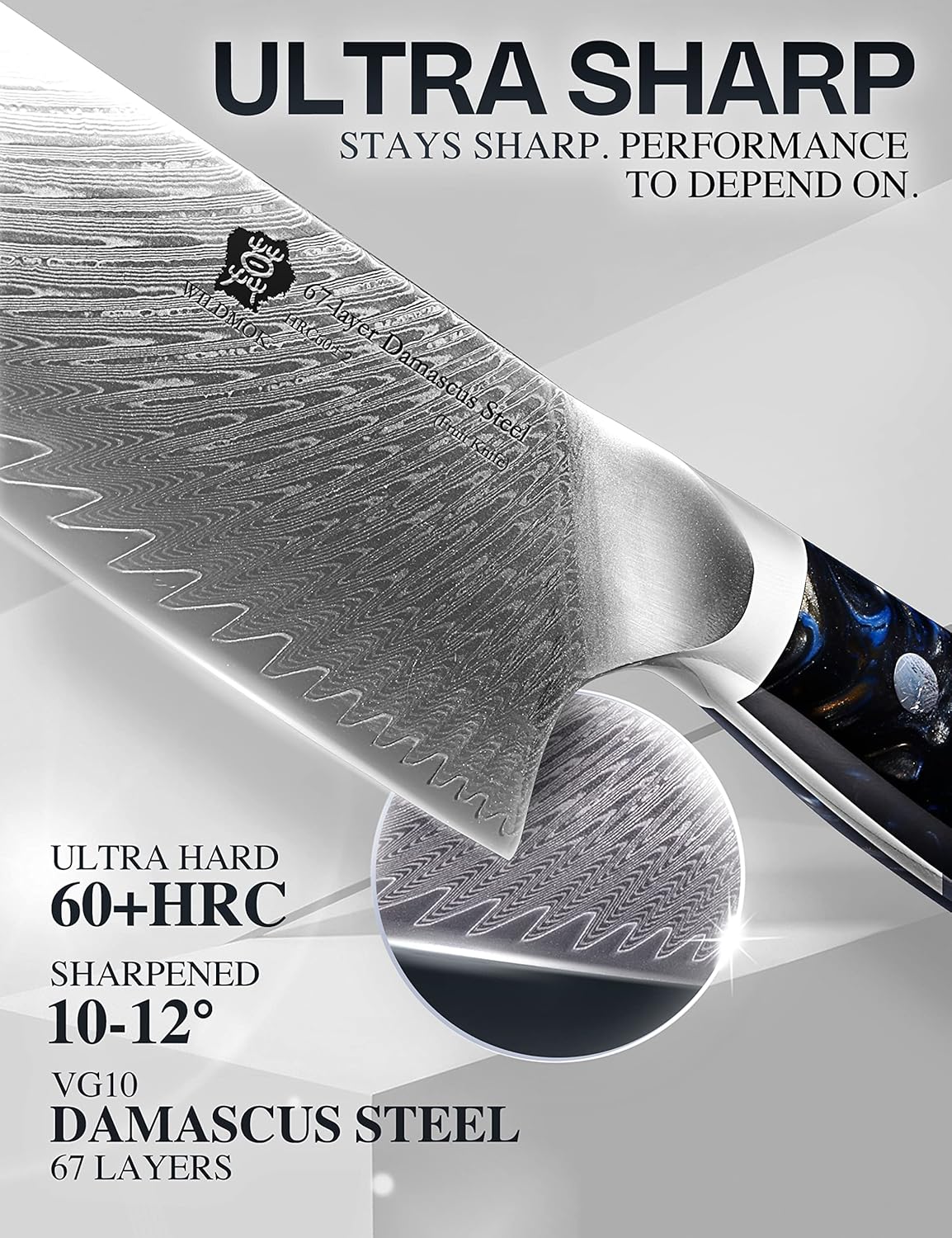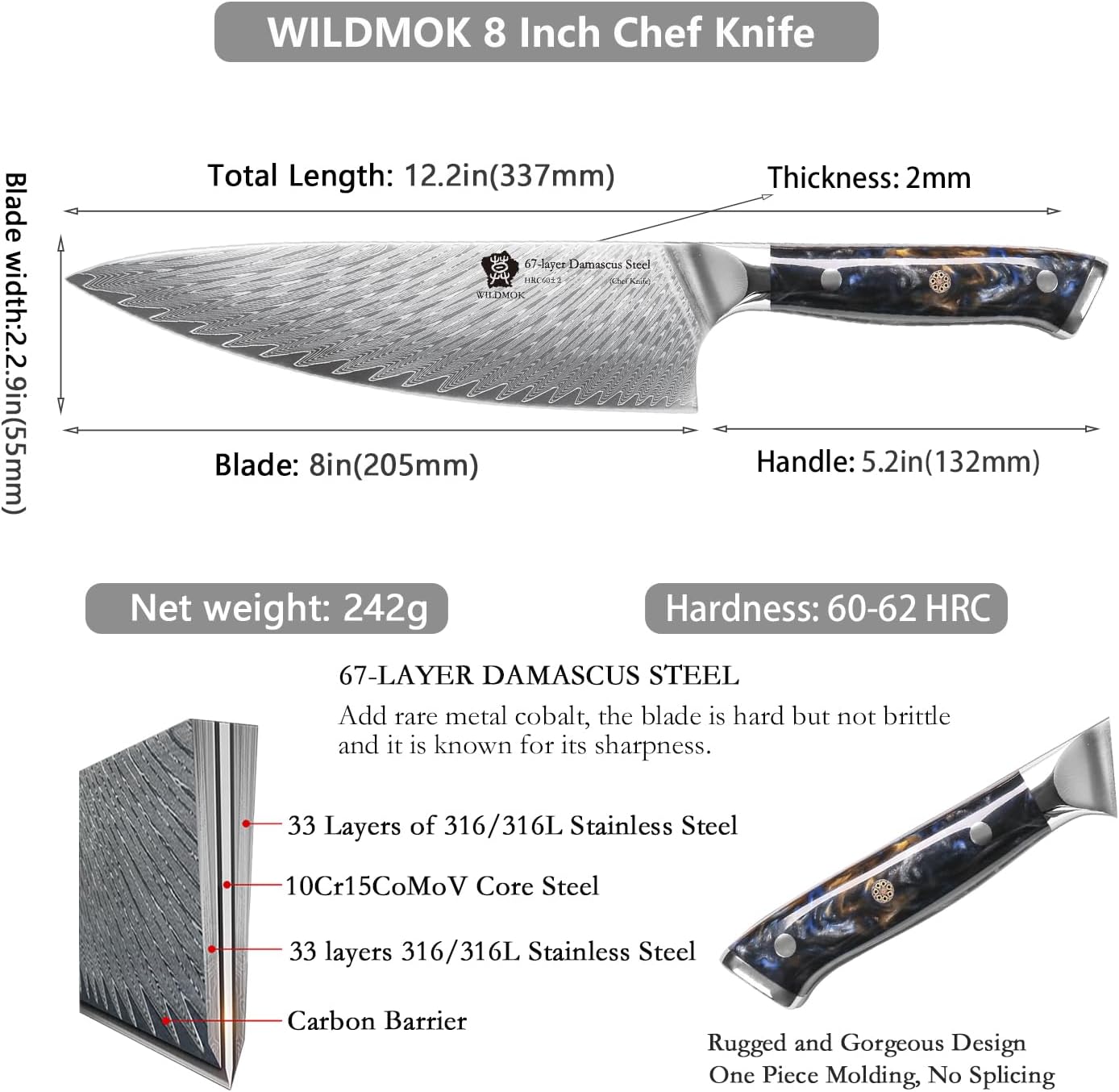 • 【Professional Damascus Chef Knife】WILDMOK chef knife use high quality Japanese 67 layers damascus steel, professional 8 inch chef knives and best gifts for chefs kitchen knives. The Rockwell hardness of the cutting core is 60+. The cutting edge is 10-12 degrees, making it useful for good edge strength while maintaining excellent sharpness.