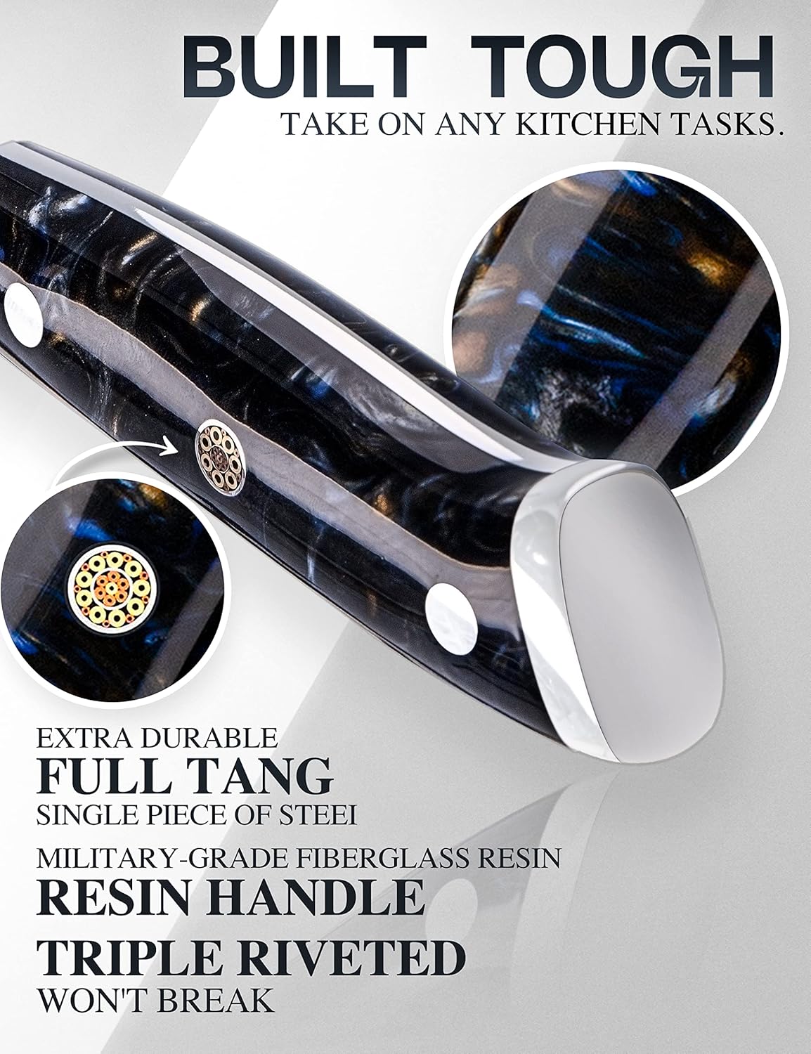 • 【Full Tang Resin Handle】Made of all resin handle which stronger and more stable than G10 handle! This is what Differentiates WILDMOK Knives from the Competition. Resin Handle Triple Riveted to the Forged Full Tang for Extra Strength, Tastefully Adorned with the Classic 3-Metal Mosaic Rivet - feels sturdy and turns heads with its rugged and gorgeous design.