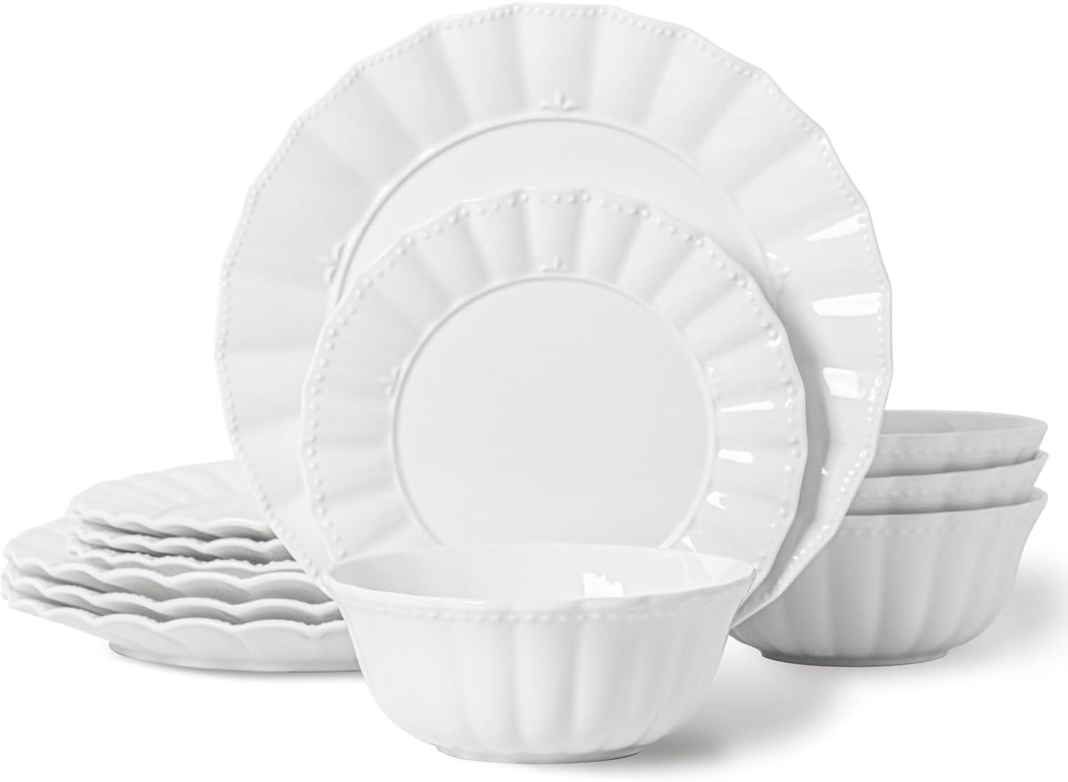 Plates and Bowls Sets, 12 Piece Dinnerware Sets Bone China, Porcelain Dinner Set with Cereal Bowls, Ceramic Soup Bowls, for Pasta, Salad, Gift Idea, Wavy Pattern