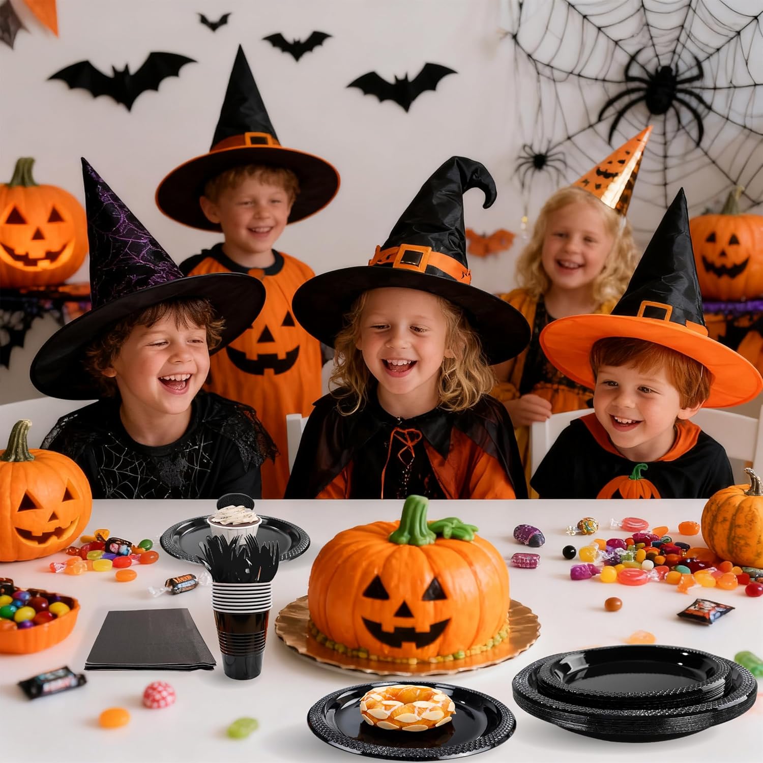 • HEALTH & SAFETY:Our halloween plates and napkins are sturdy and durable, made of 100% food-grade plastic and BPA-free. Plastic black plates are paired with cutlery, plastic cups and napkins in the same color for a simple yet sophisticated look that can add a touch of class and style to your party.