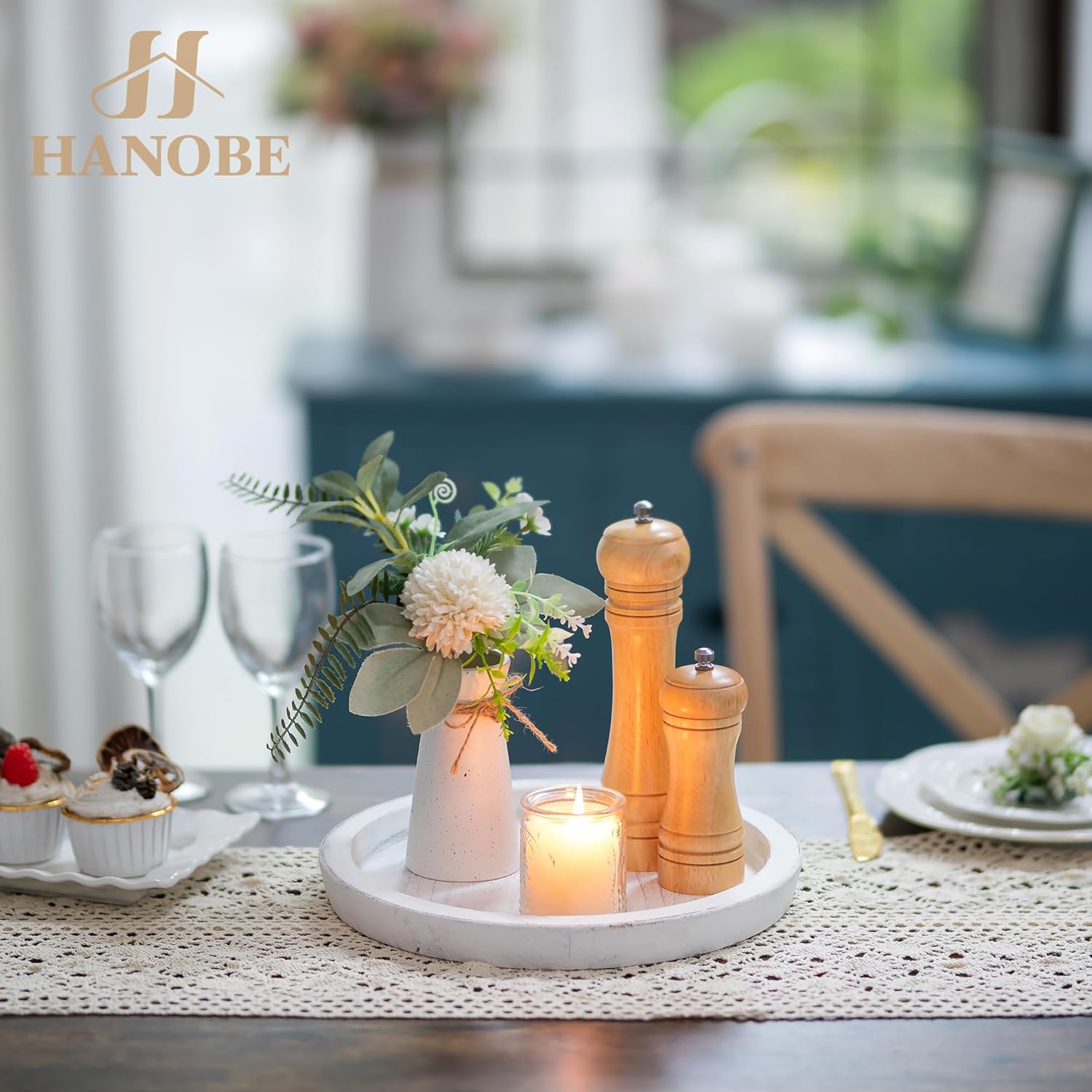 Hanobe Rustic Wooden Serving Tray: Round Wood Decorative Tray Rustic White Centerpiece Candle Holder Trays Farmhouse Ottoman Tray for Decor Kitchen Counter Home Decor for Coffee Table