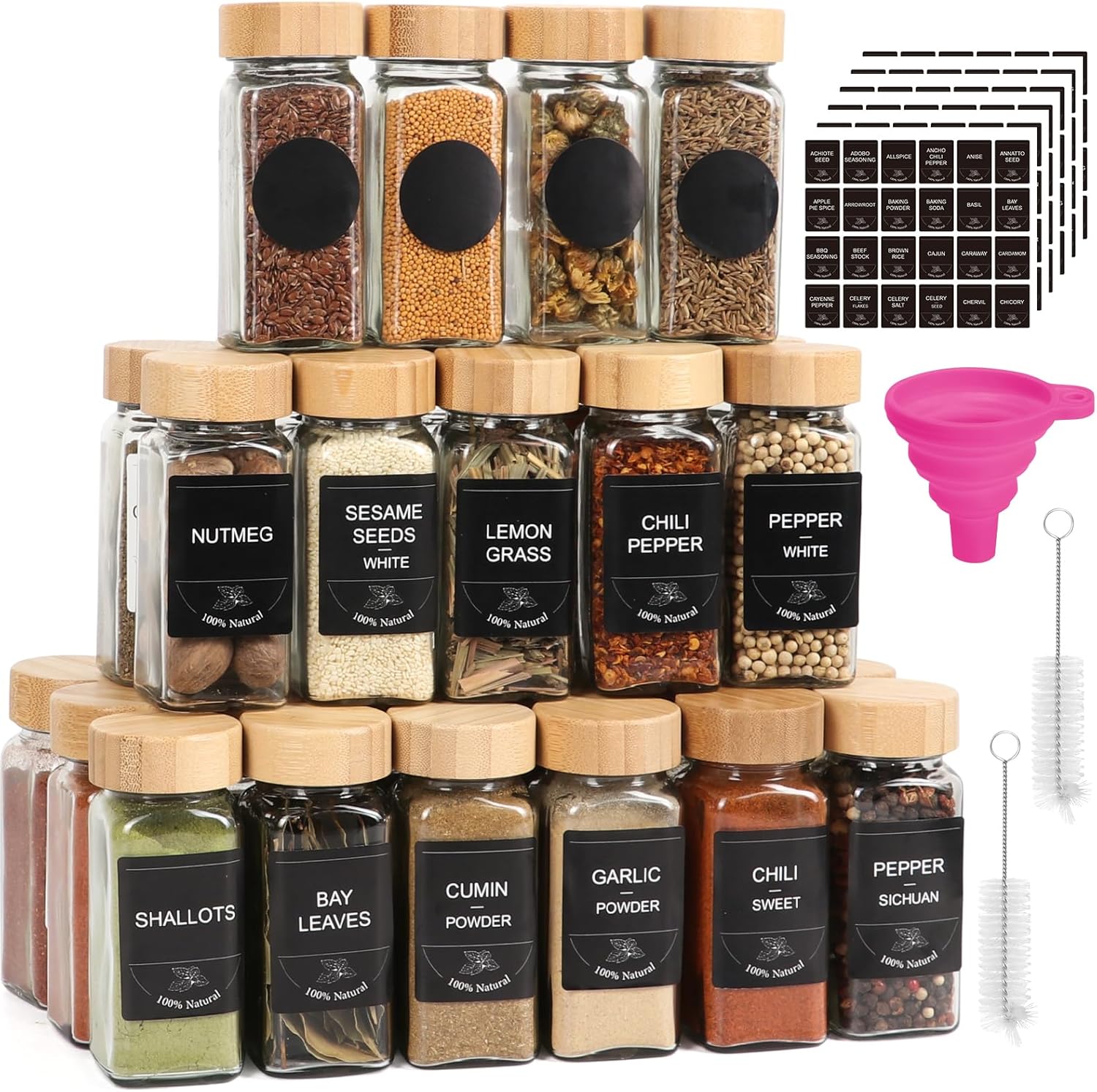 • 2-IN-1 SHAKER LID: Our glass spcie jars have dual functional 2-in-1 shaker lid for pouring out granulated spices and herbs on one side and sprinkling powdered spices on the other, which can meet your daily need without changing the lids. And the airtight bamboo lids to keep the spice fresh and dry.