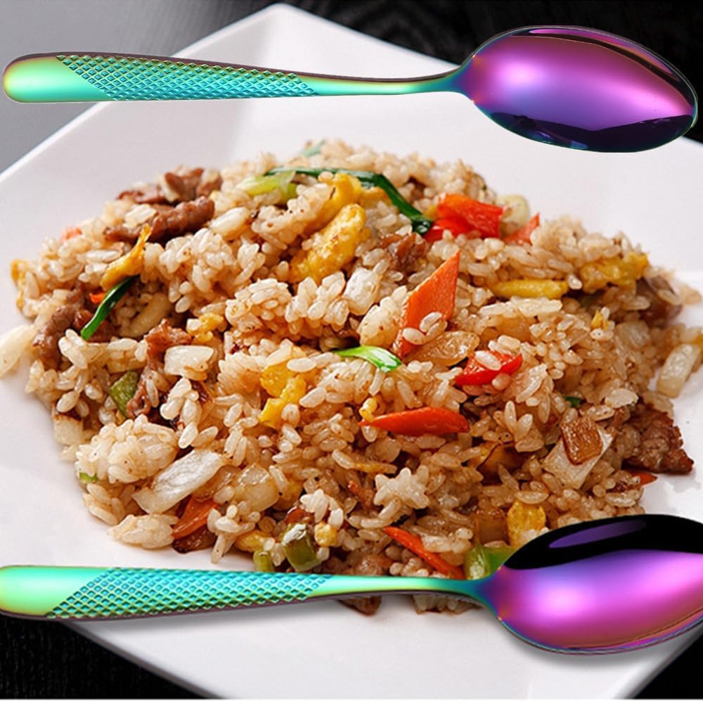 • SMOOTH SPOON EDGES: The Rainbow Stainless Steel Cutlery Set has smooth spoon edges which makes it easy to scoop food. The set includes dinner spoon, tablespoon, dinner fork and dessert fork. The utensils are made of stainless steel and are dishwasher safe