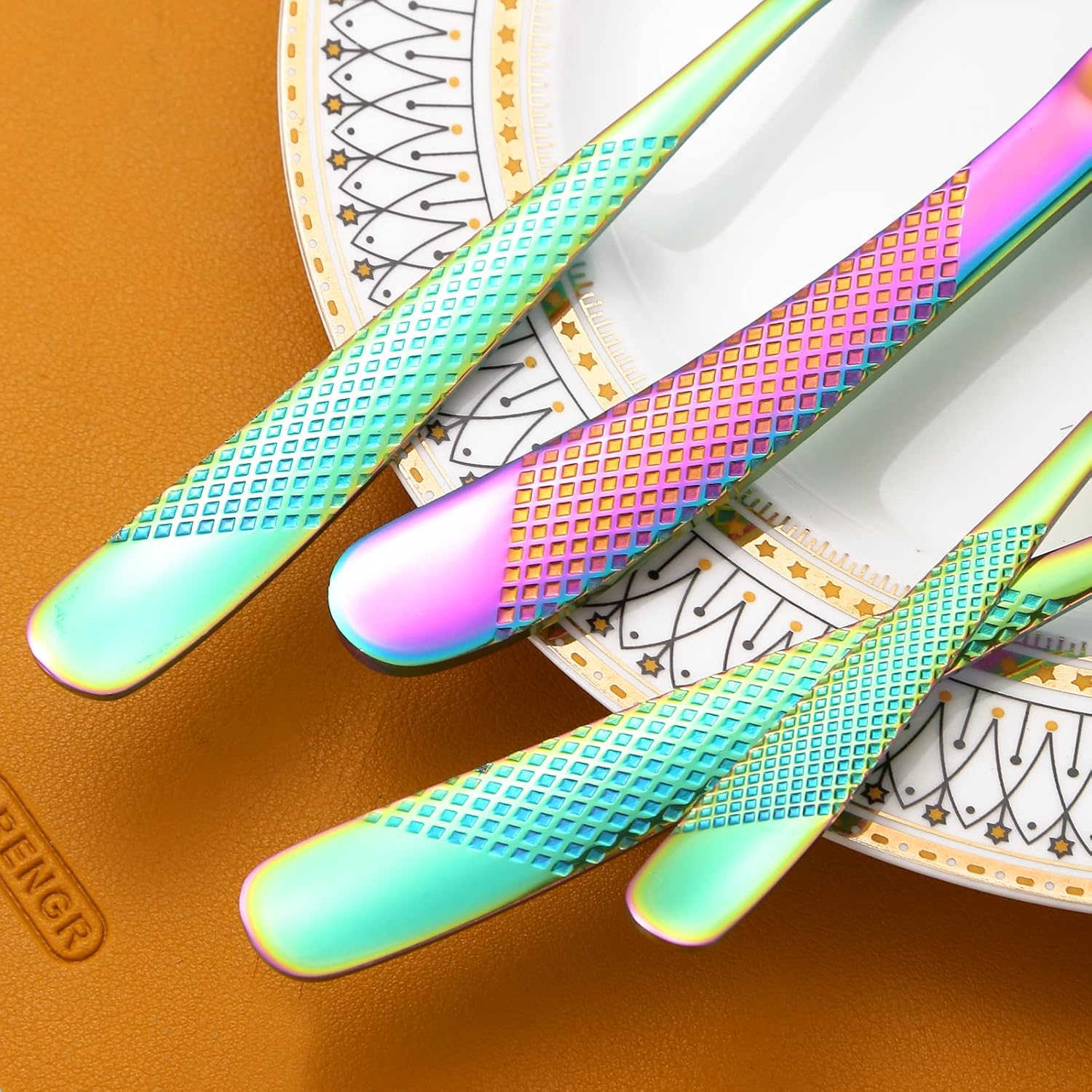 • QUALITY CRAFTSMANSHIP: Add a touch of elegance to your dining experience with this set of 20 rainbow-colored hammered eating utensils. Crafted with quality materials, these ktichen utensils are not only beautiful but also durable for everyday use