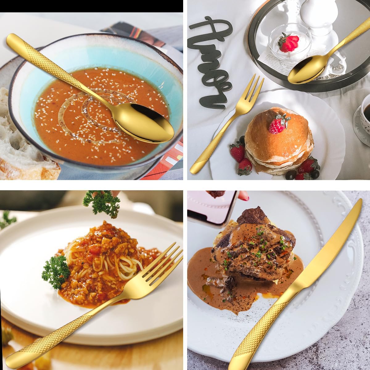 • SILVRWARE FOR SPECIAL OCCASIONS OR EVERYDAY USE: Add an elegant touch to your dining experience with these modern gold silverware set. The hammered design adds a contemporary flair, making it designed specifically for special occasions or everyday use