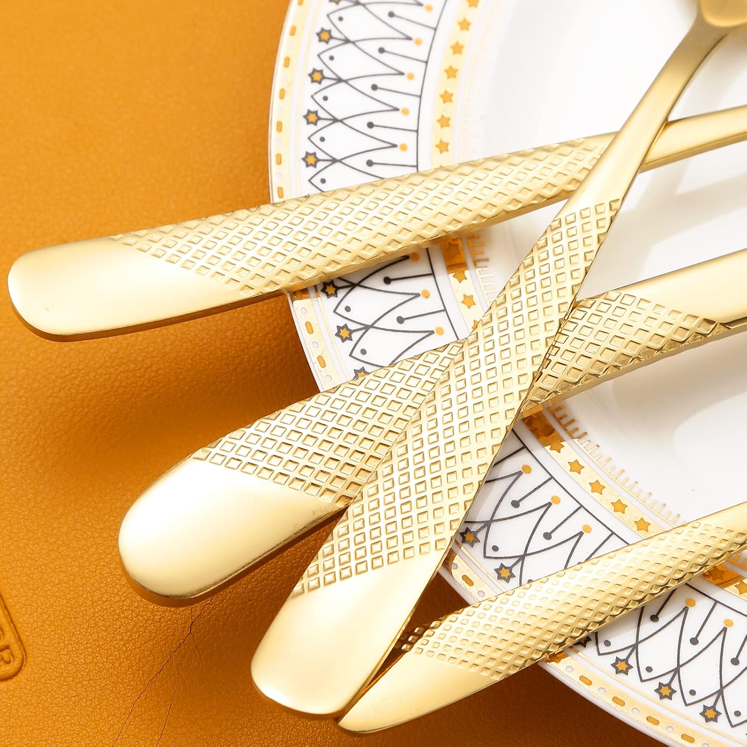 • EASY TO CLEAN: This gold cutlery set stainless steel is easy to clean and dishwasher safe. The set includes four salad forks, four dinner forks, four dinner knvies,four dinner spoons, four teaspoons. The modern design is designed specifically for any kitchen