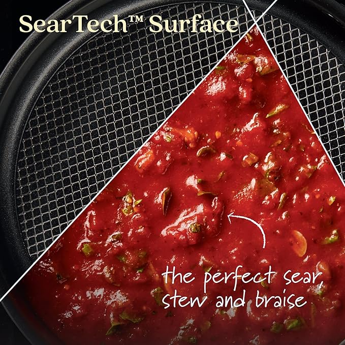 • SEARS LIKE CAST IRON: No other saute pan has it. Exclusive SearTech(tm) technology combines an innovative base and stainless steel mesh engineered to keep oil in the middle of the sauteuse, letting heat and fats unite for incredible caramelization and browning. Create the best flavors without the bulky weight, difficult cleanup, or need for complicated seasoning.