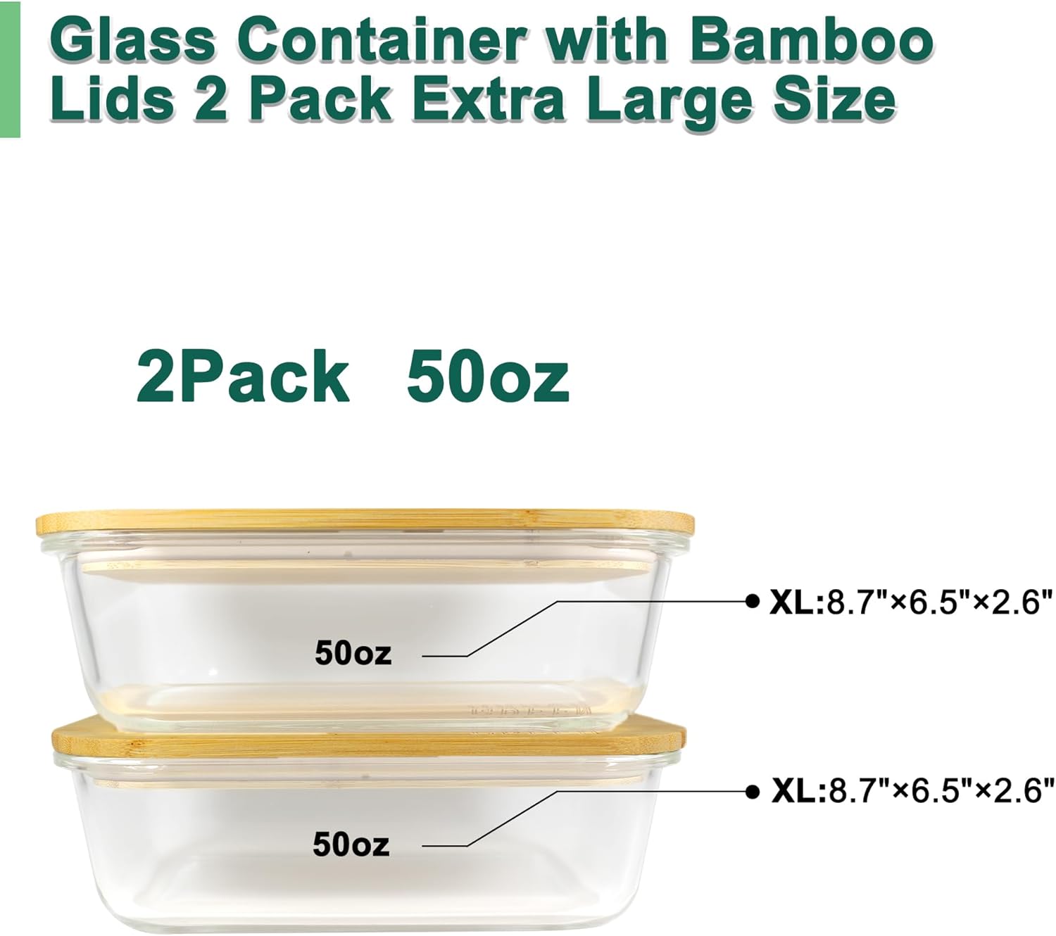 • ✅2 PACK of LARGE SIZE: 2 Pack of X Large Size, Glass Container size without Bamboo Lid is 50OZ dimension (8.7x6.5x2.6), it is perfect for family size meal, great choice to cook or store a large portion of food. Our Bamboo Lid is airtight lid not leak proof lid. Bamboo Lid is not recommended to wash in dishwasher.