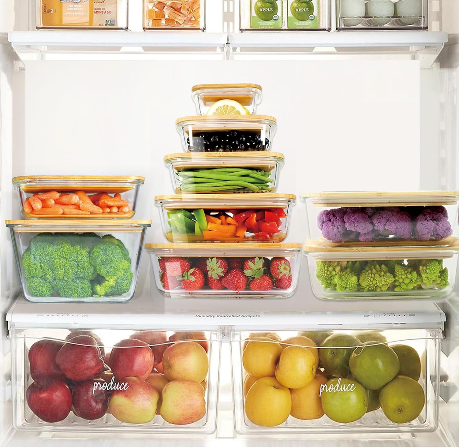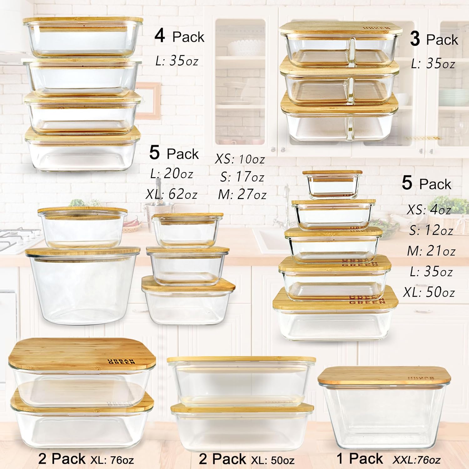 • ✅ ALL-IN-ONE USE: Simply use our glass container for meal prep, our 5 different sizes give you generous storage space for all needs, straight from the food prep to the oven cook. Our borosilicate glass is oven safe up to extremely high temperature 600F degree, server the delicious meal for lunch or dinner after cooking then storage the leftover in the container with airtight bamboo lids in the fridge. You can also use as a lunch box and to warm in microwave or oven for the next day.