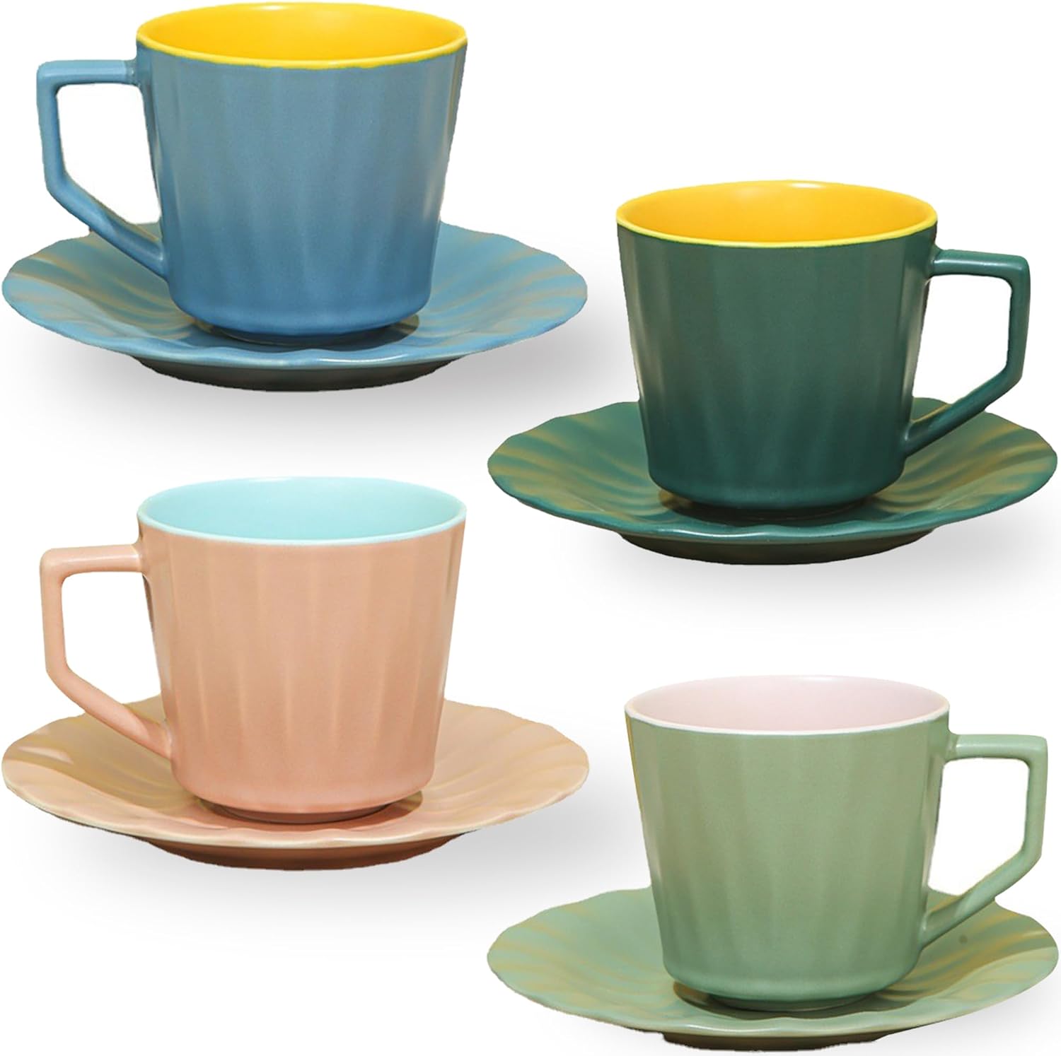 Tea Cups and Saucers, 7.5 OZ Large Espresso Cups Set of 4, Porcelain Coffee Mug and Saucer, Dishwasher & Microwave Safe for Cappuccino, Latte, Mocha, Tea Party, Birthday Gift