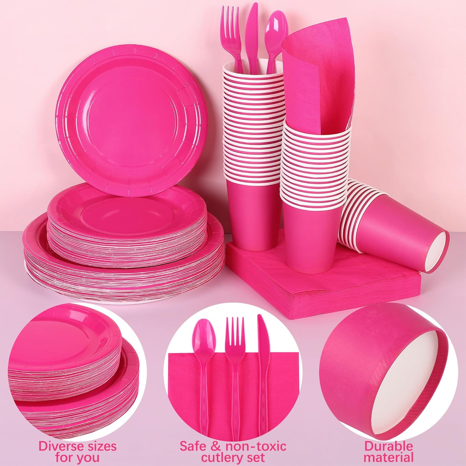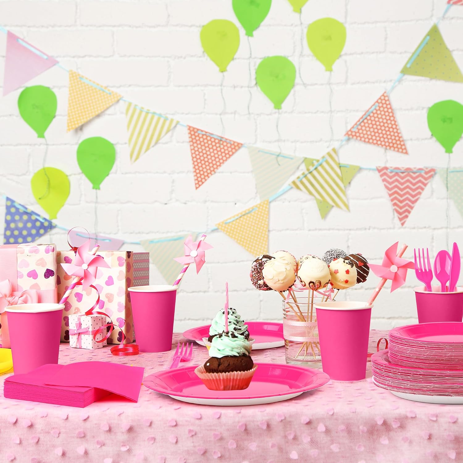durony 350 Pieces Hot Pink Paper Dinnerware Set 7 Inch 9 Inch Disposable Dinner Plates Serve 50 Guests Paper Cup Cutlery Napkins Solid Color Party Supplies for Birthday Wedding Party Family Picnic