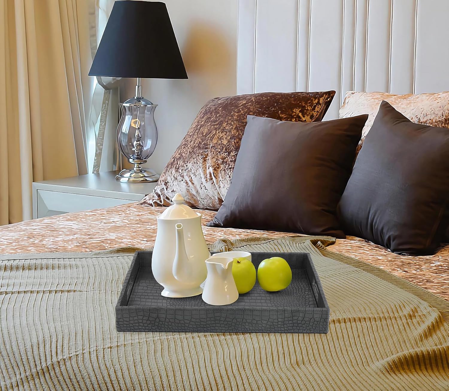 HofferRuffer Rectangle Serving Tray with Hole Handles for Coffee Table, Breakfast, Tea, Food, Butler - Countertop, Kitchen, Vanity Serve Tray, 16.2 x 12.2 x 2 inches, Faux Leather Tray (Dark Grey)