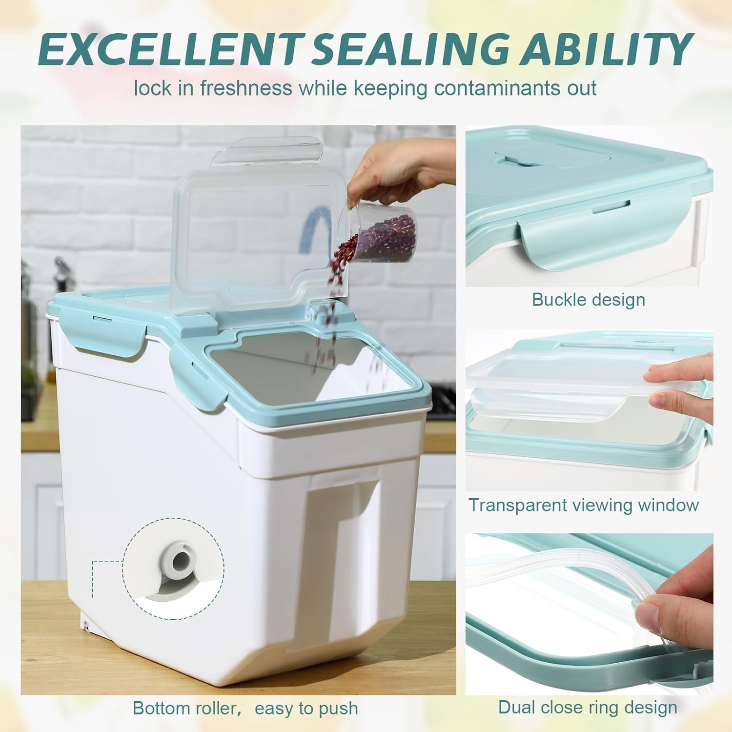 Sunnyray 4 Pcs 55 lbs Grain Rice Storage Container Blue Flour Bin with Wheels Cup Leak Proof Pet Food Storage Boxes Seal Locking Lid Plastic Rice Containers Set for Cereal Flour Cat Dog Food Kitchen