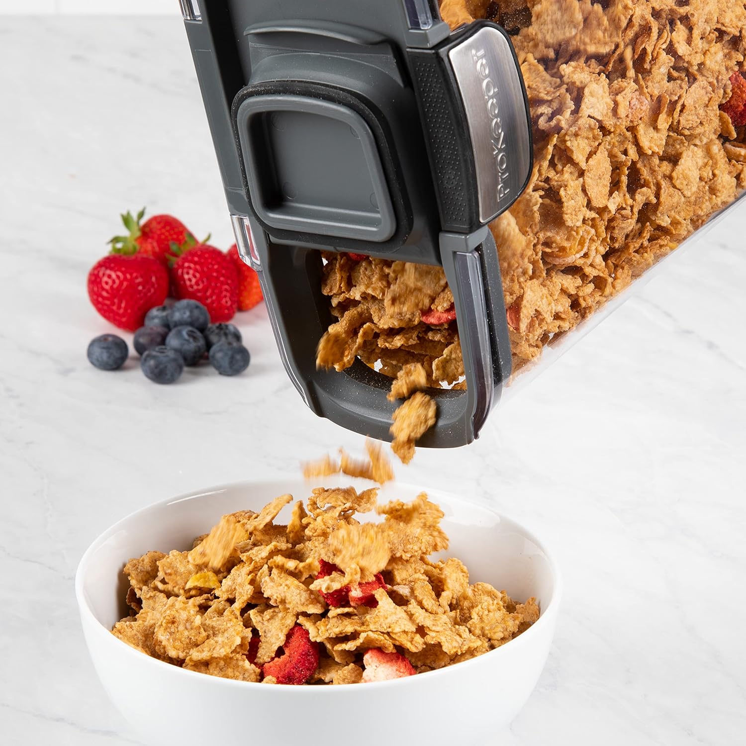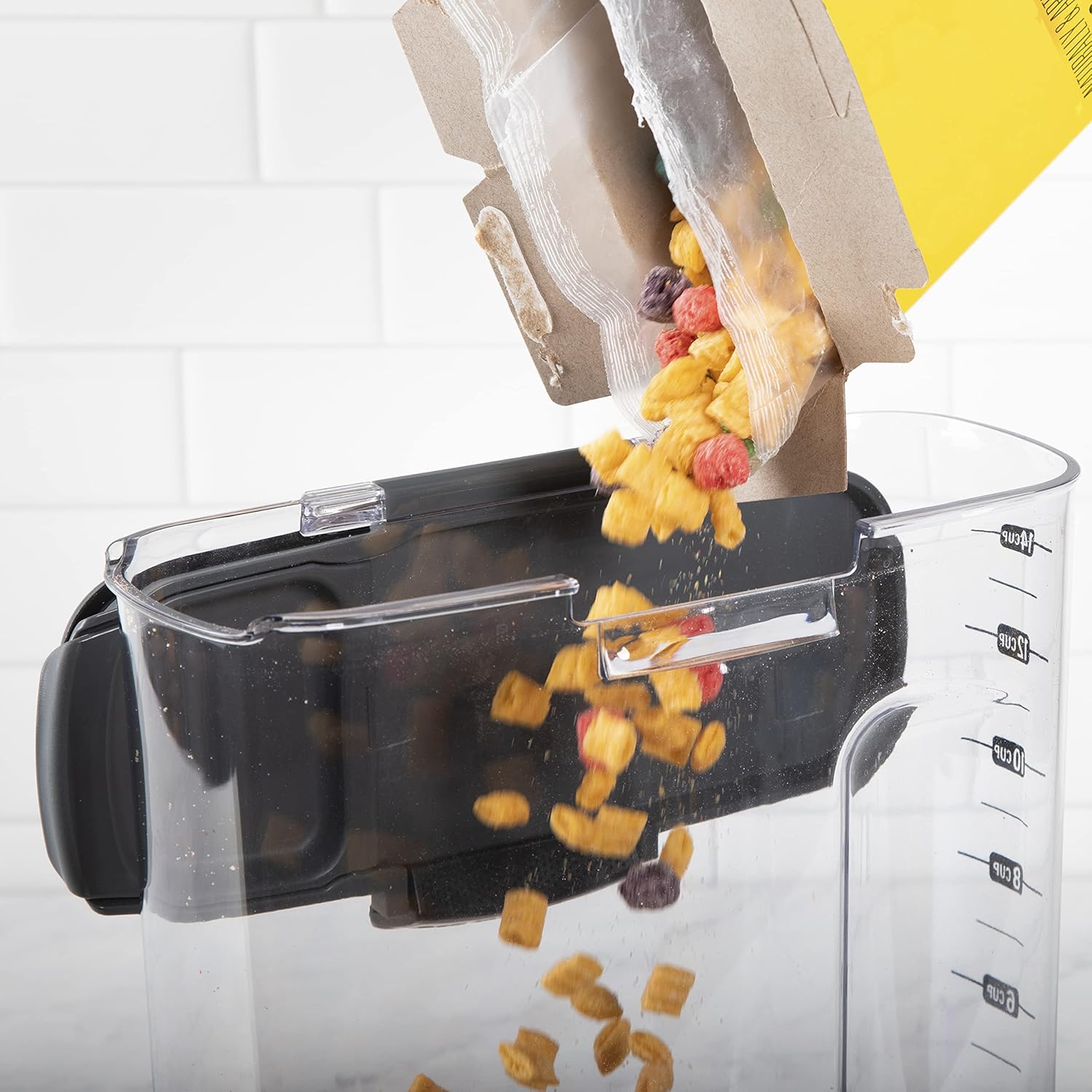 • Holds a standard-size cereal box. Wide mouth pour spout is great for pouring all cereal types. Features a silicone seal for airtight storage. Flip & pour spout and contoured body provide ease of use. Measurement markings up to 14 cups indicate the remaining cereal. Dishwasher safe with a 4.2 QT (4.0 L) capacity.