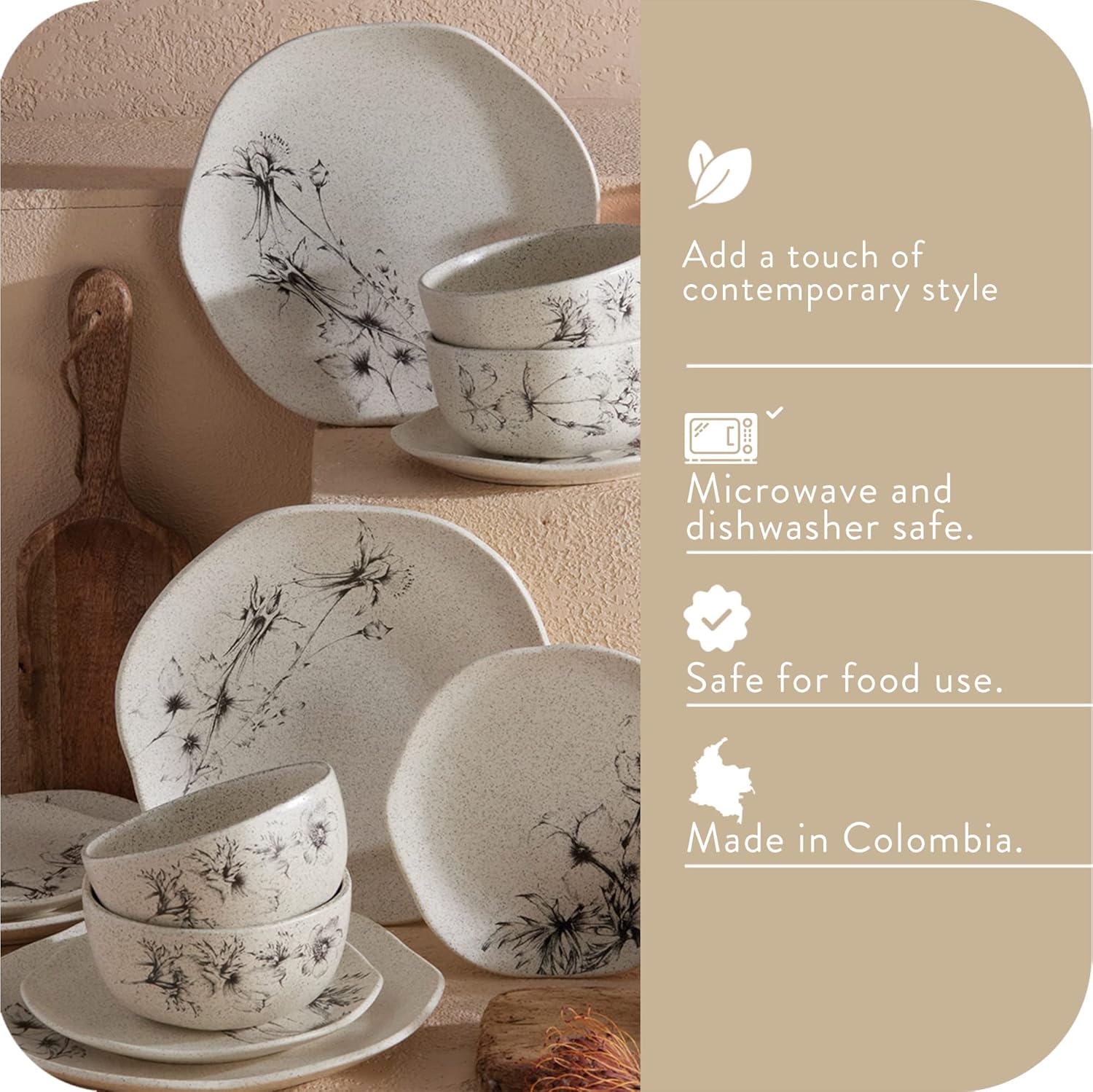 Corona Dinnerware Set 12– piece, Plates and Bowls Set, Ceramic Sets for 4, Microwave and Dishwasher Safe, Elea Floral Design