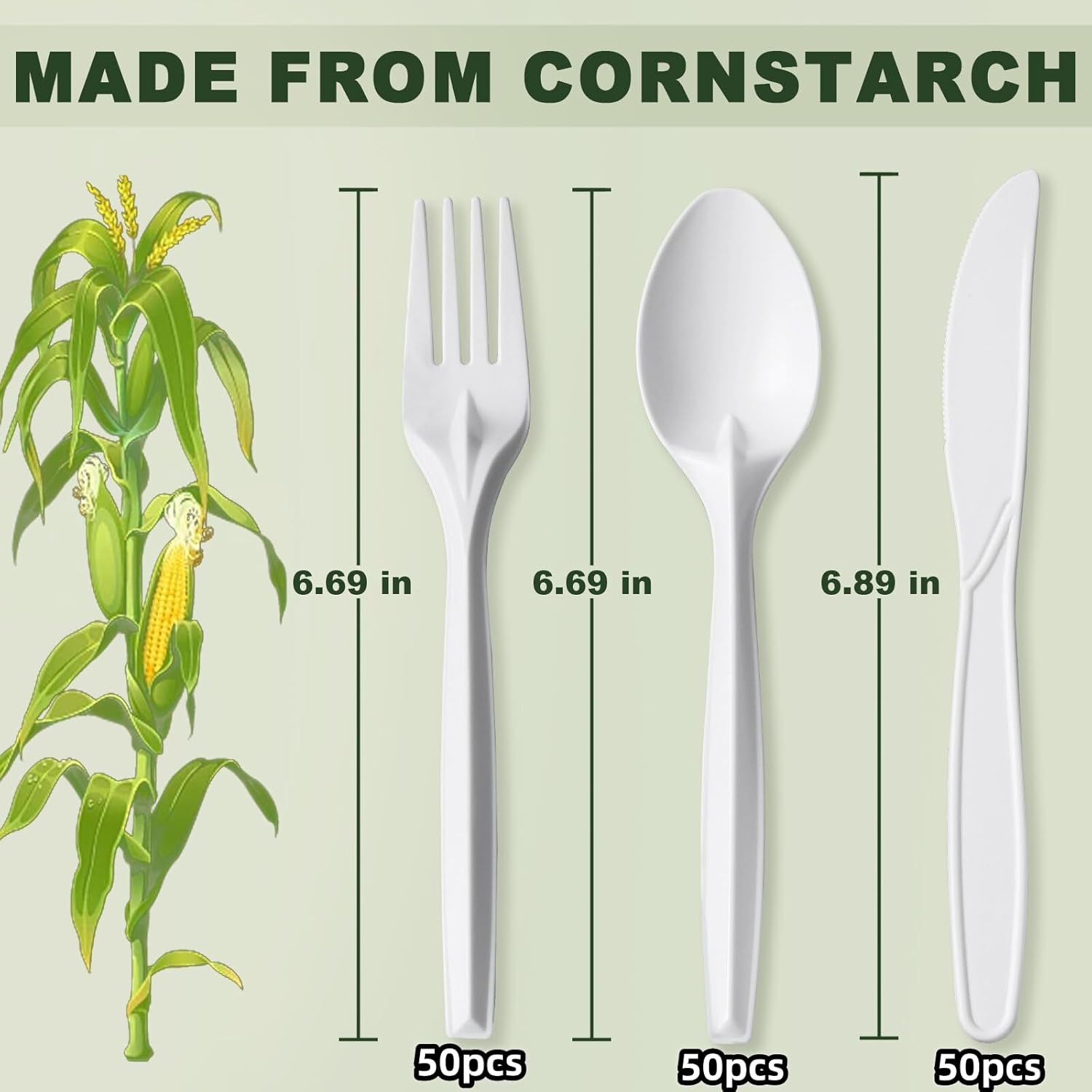 • [Compostable eco friendly cutlery Set]: The disposable utensils set includes 50 Compostable forks, 50 Compostable spoons, and 50 Compostable knives. You can use these disposable tableware sets for parties, birthdays, camping, picnics, daily gatherings, Halloween, weddings, and special events. After the party, you no longer need to worry about the table being dirty and messy, free your hands to go to the dishwasher. Make it easy for you to enjoy entertainment time.