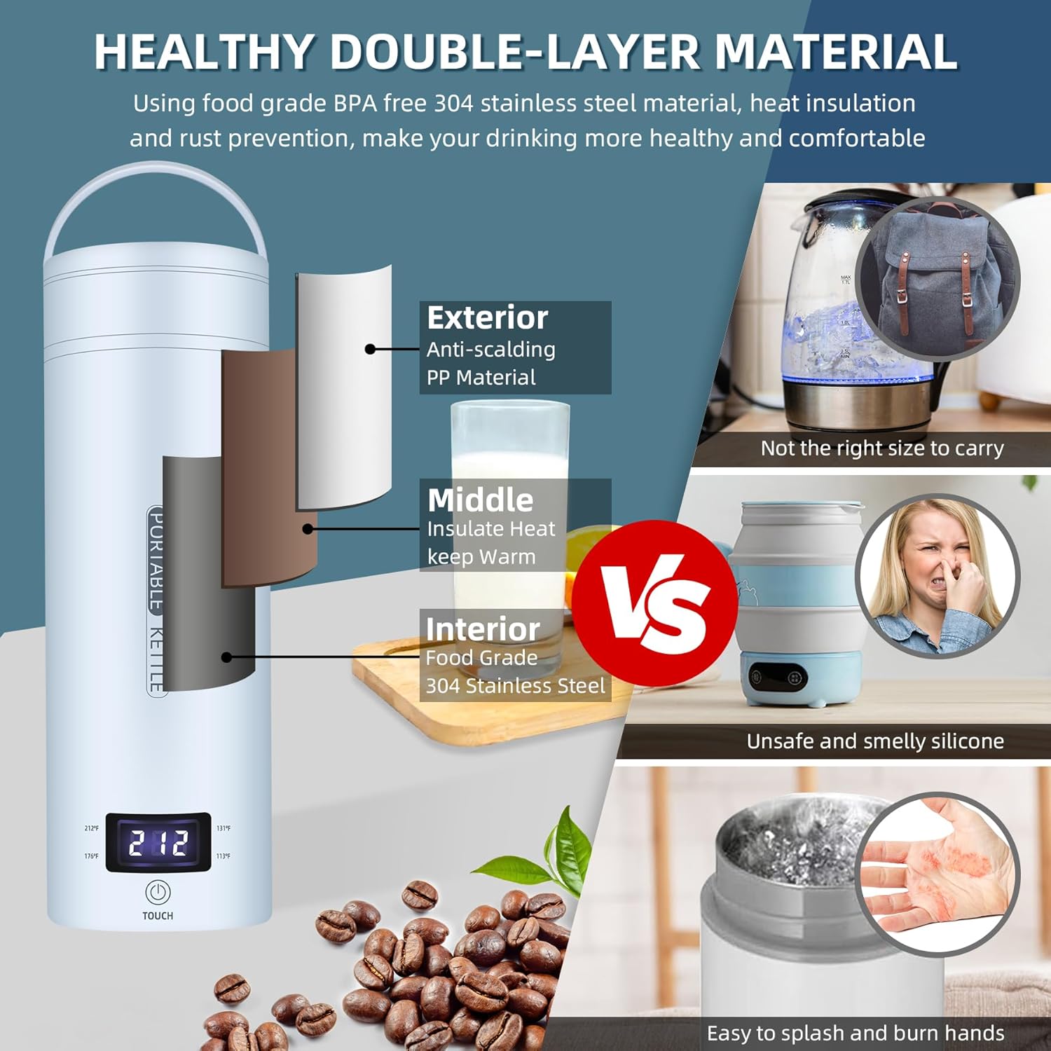 • Heat Insulation to Avoid Scalding - Small electric kettle for travel features double-walled PP insulation and 100% BPA-free 304 stainless steel to keep the water warm while preventing the surface temperature of electric water boiler from overheating. It is designed with a vent on the lid to help reduce the pressure of boiling water. You can close the lid and boil water without worrying about getting burned. Our food grade portable electric kettle provide you with healthy drinking water.