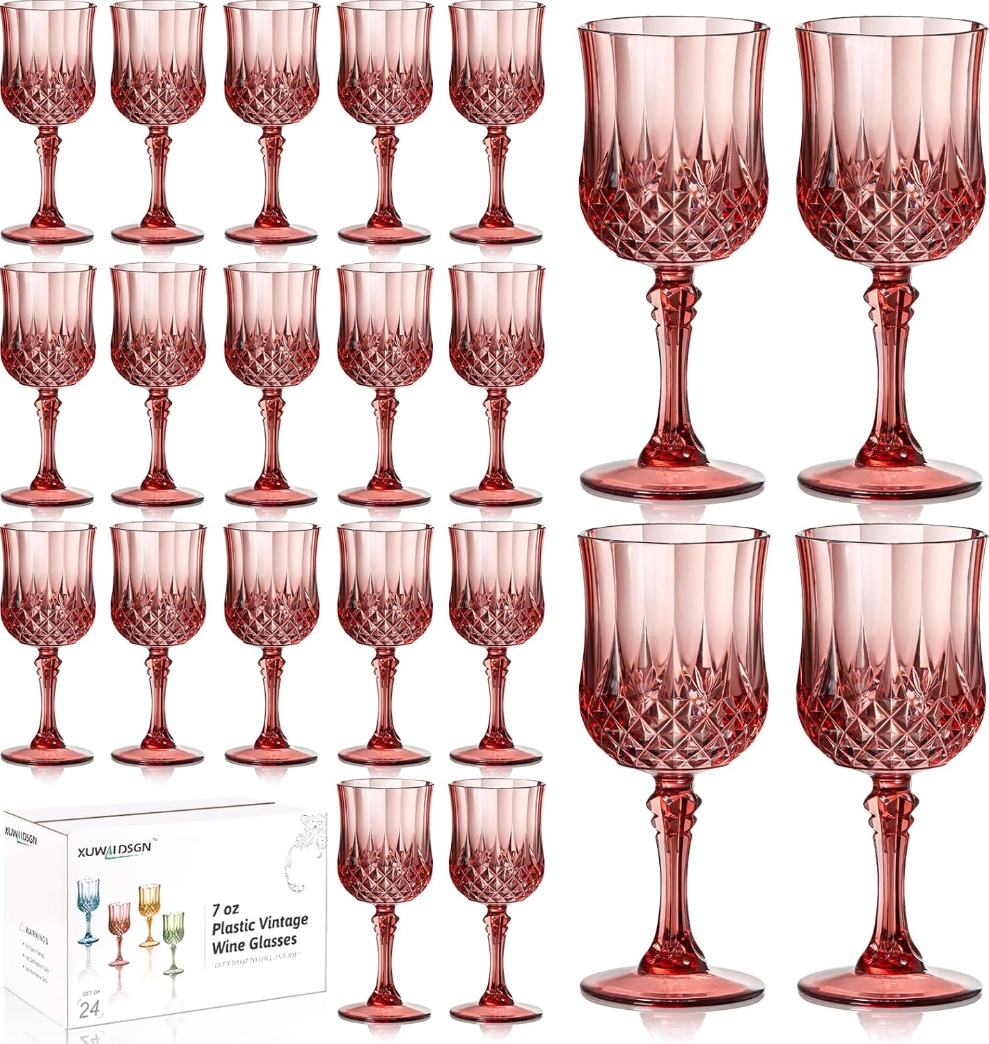 XUWAIDSGN 7oz Plastic Vintage Rose Gold Drinking Glasses Pink Wine Glasses Unbreakable Wedding Glassware Crystal Water Goblets Reusable Drinkware Vintage Champagne Flutes (24, Rose Gold)
