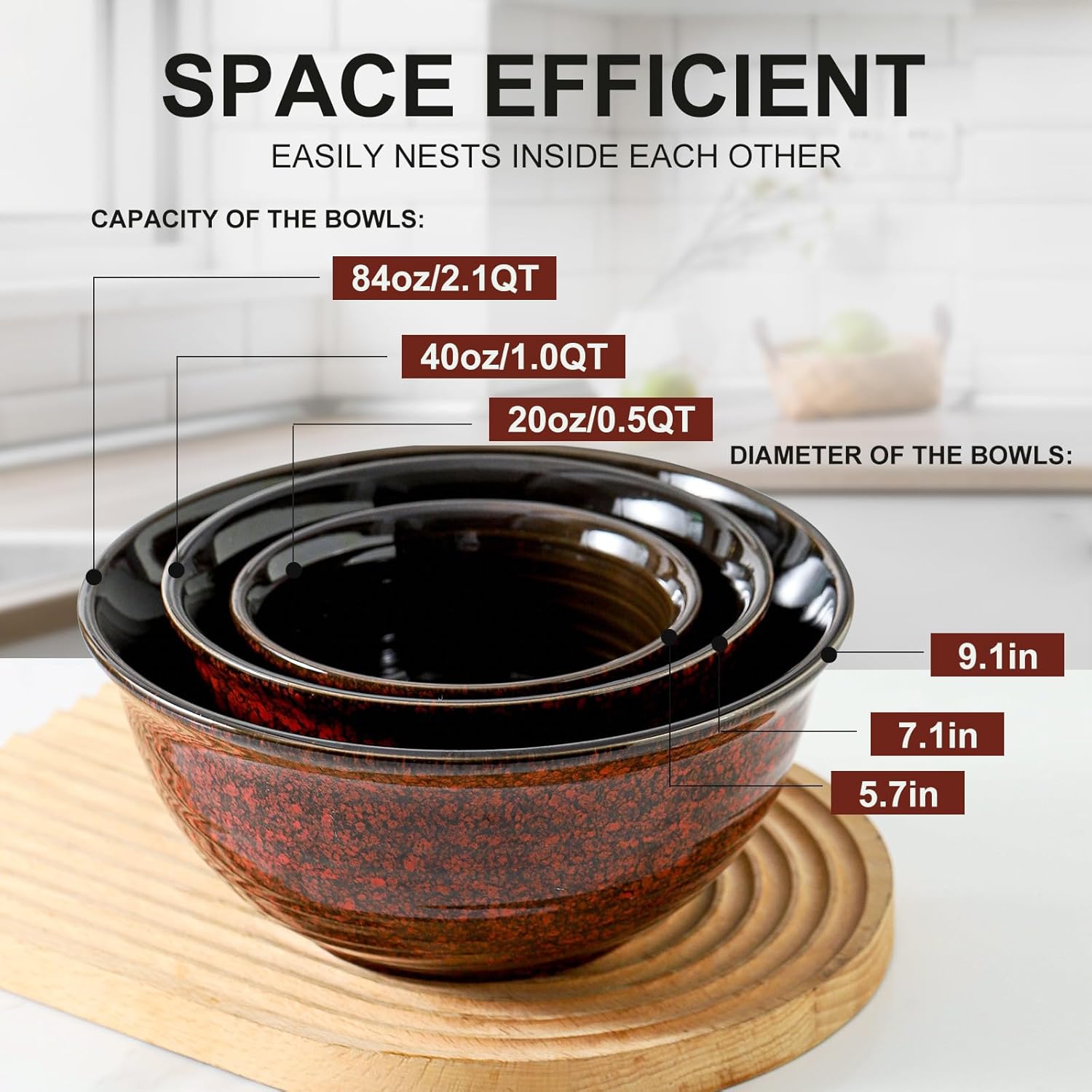 Hasense Ceramic Mixing Bowls, Large Serving Dishes Set of 3 for Cooking, Baking, Prepping, Porcelain Nesting Bowls for Salads, Fruit, Popcorn, Cereal, 2.1/1.0/0.5 Qt, Dishwasher & Microwave Safe, Red