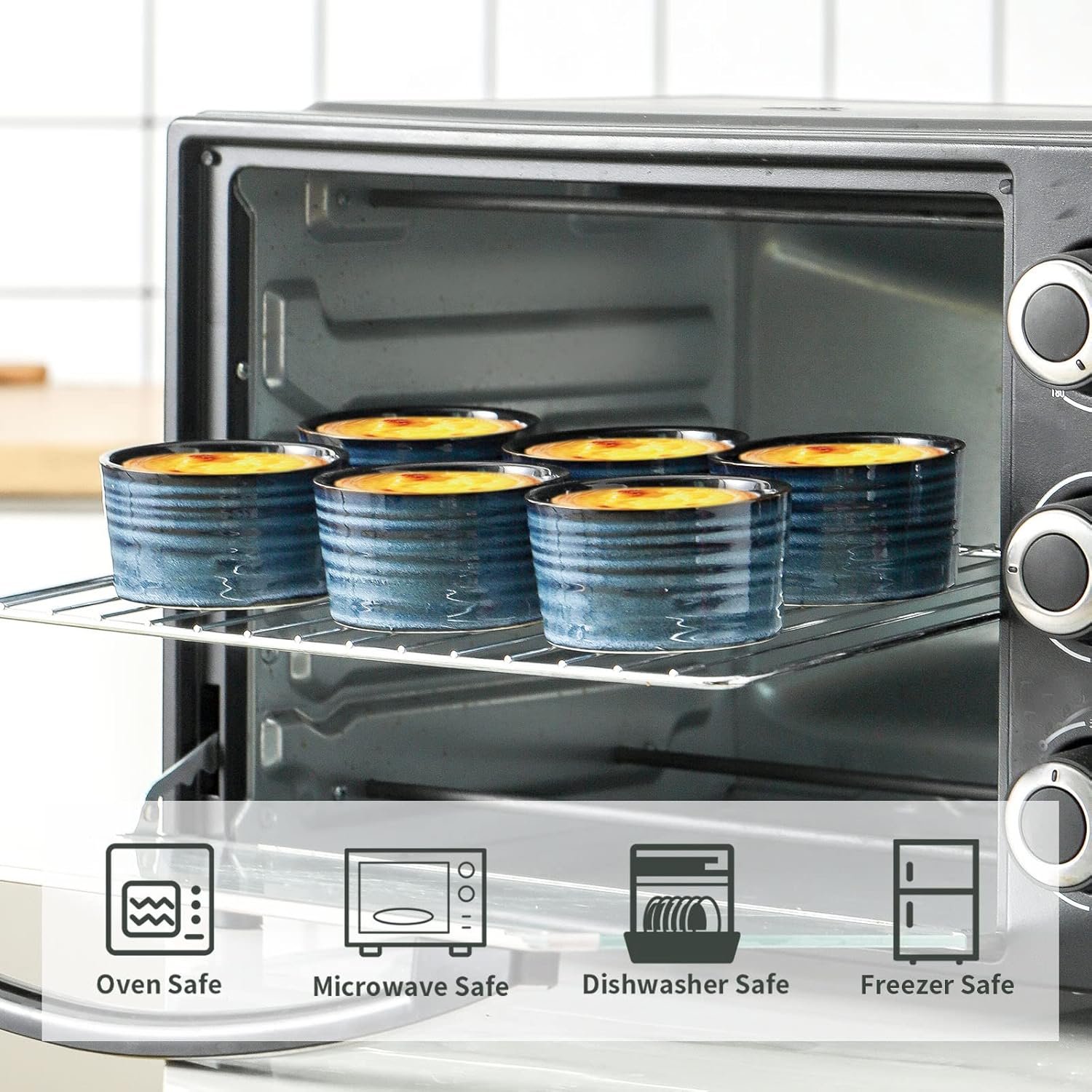 Ceramic Ramekins 6 oz, Oven Safe Souffle Dish Set of 6 for Baking, Porcelain Dipping Sauce Bowls for Creme Brulee,Stackable Custard Cups for Pudding, Ice Cream, Lava Cakes, Blue
