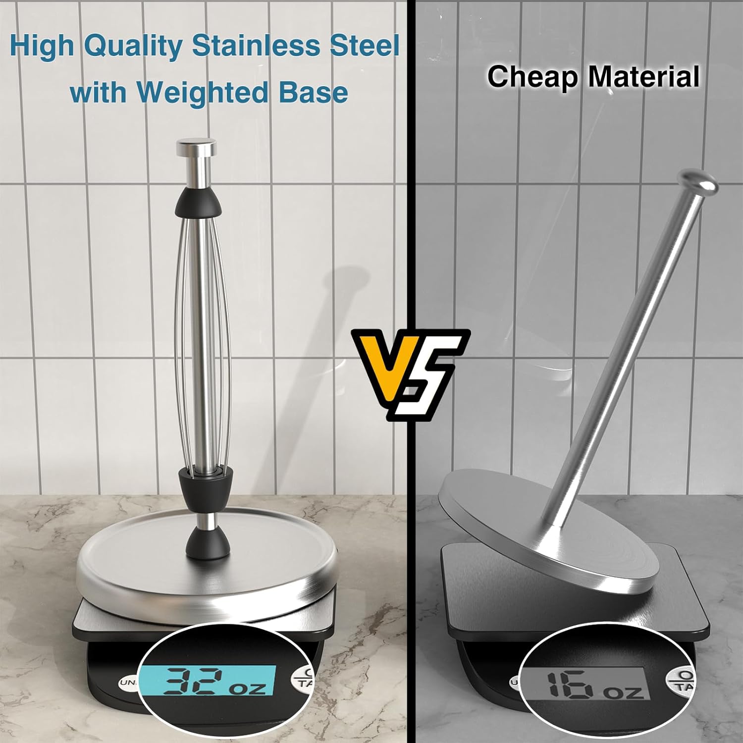 • STUDY WEIGHTED BASE WITH NON-SLIP PAD:With weighted base to make sure that countertop paper towel holder won't shake when you tearing the paper. Non-slip EV pad at the bottom, won't scratch your desktop. Outstanding kitchen decor and accessories!