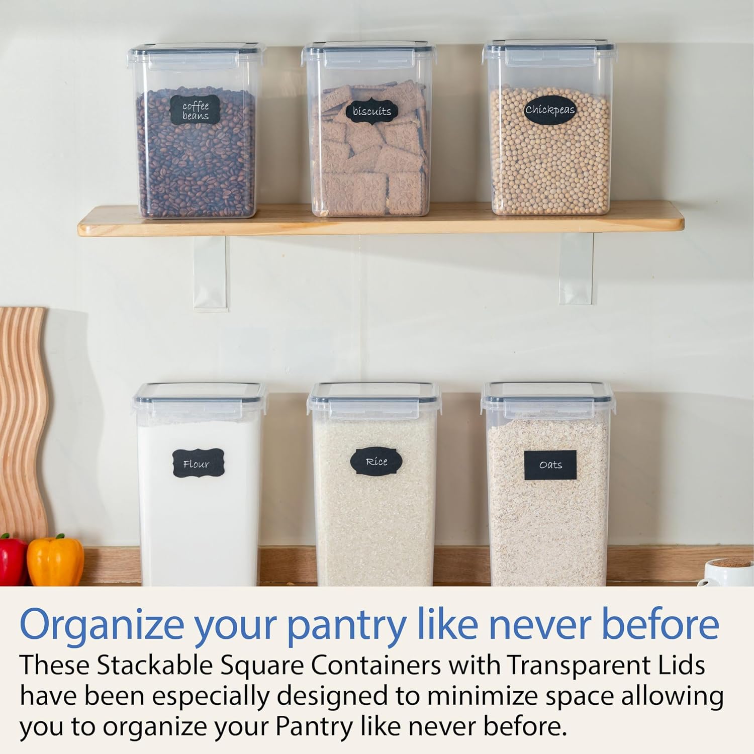 • Complete Set with Measuring Cups & Labels. Level up your pantry organization with a sleek, modern touch to your kitchen. This six-pack set includes measuring cups, 10 reusable labels, and a chalkboard marker for hassle-free labeling and storage.