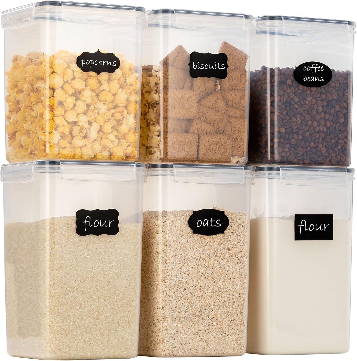 • Versatile Food Storage Containers (6-Pack). Organize your pantry storage with this set of three 6.5L (220oz) and three 5.2L (175oz) bulk food storage containers. Perfect as flour sugar storage containers, our canisters hold up to 320oz of dry goods.