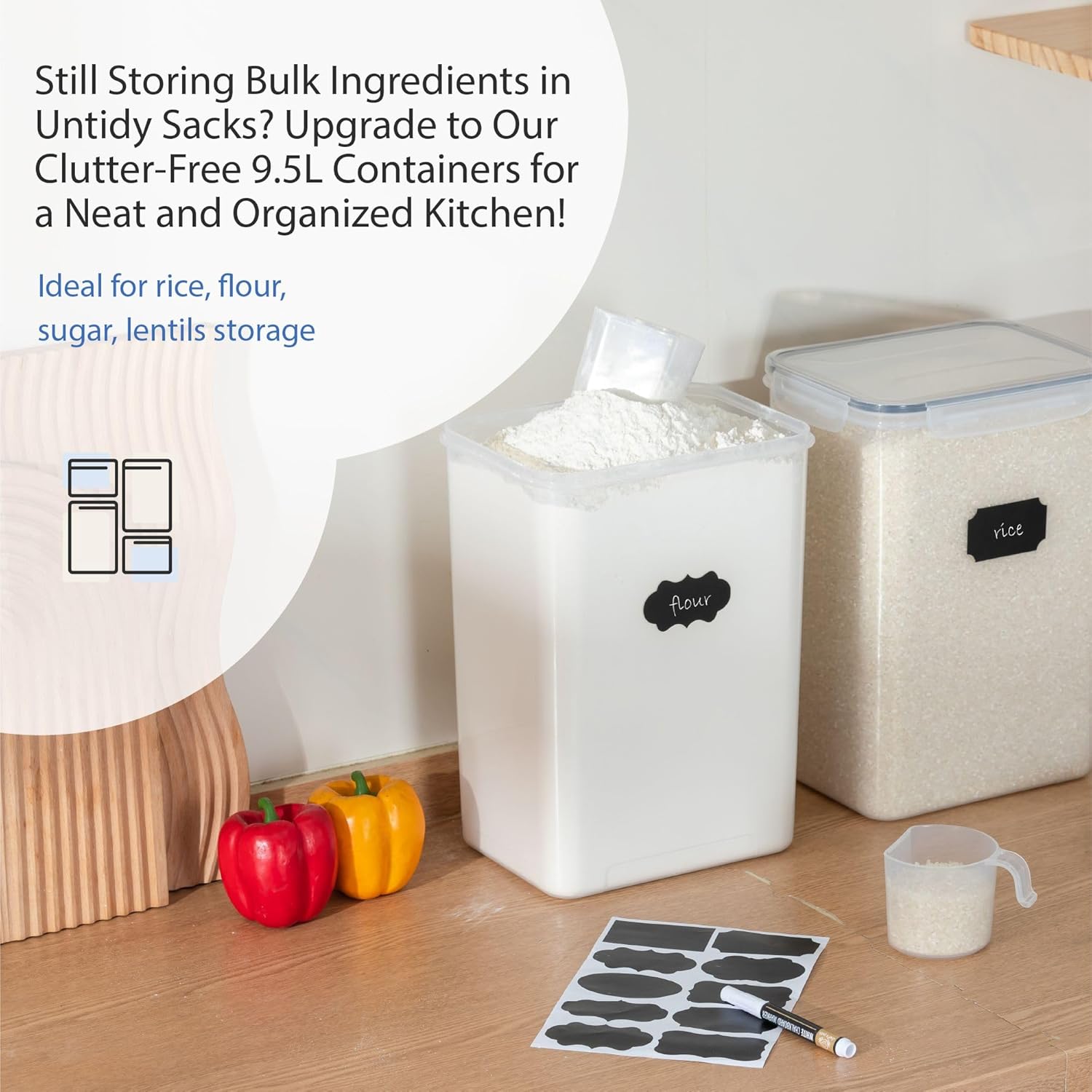 • Extra-Large 9.5L Food Storage Containers (2-Pack). Organize your kitchen and pantry storage with Chef’s Path. Perfect as flour sugar storage containers or rice storage containers, these bulk food storage containers hold up to 320oz of dry goods.
