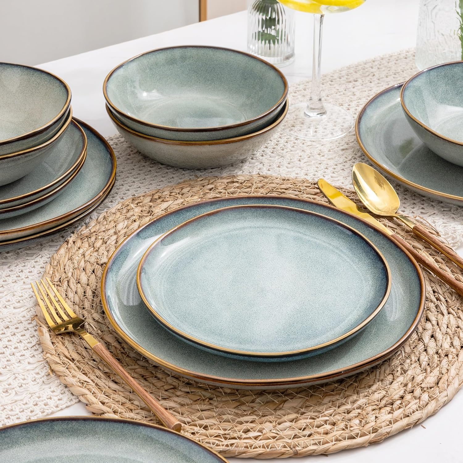 • EVERY PLATE IS UNIQUE: This dinerware set are fired with two different glazes, so the surface develops a beautiful color and makes your food look even more delicious.Since our glaze is all-natural, the surface of plates would change color on different lighting. The color may be a tad different from what you see in the images,but very item is betiful.Our glaze is also extra strong to prevent scratches from your knives and forks