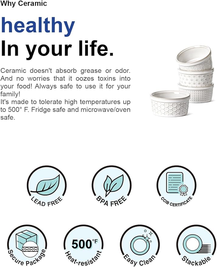 • Premium Ceramic Material:High-temperature fired ceramic ramekin, no lead and no cadmium, can withstand temperatures from -4°F to 482°F. Microwave, oven, and freezer safe, so they can move easily from the oven to the freezer to your dining table