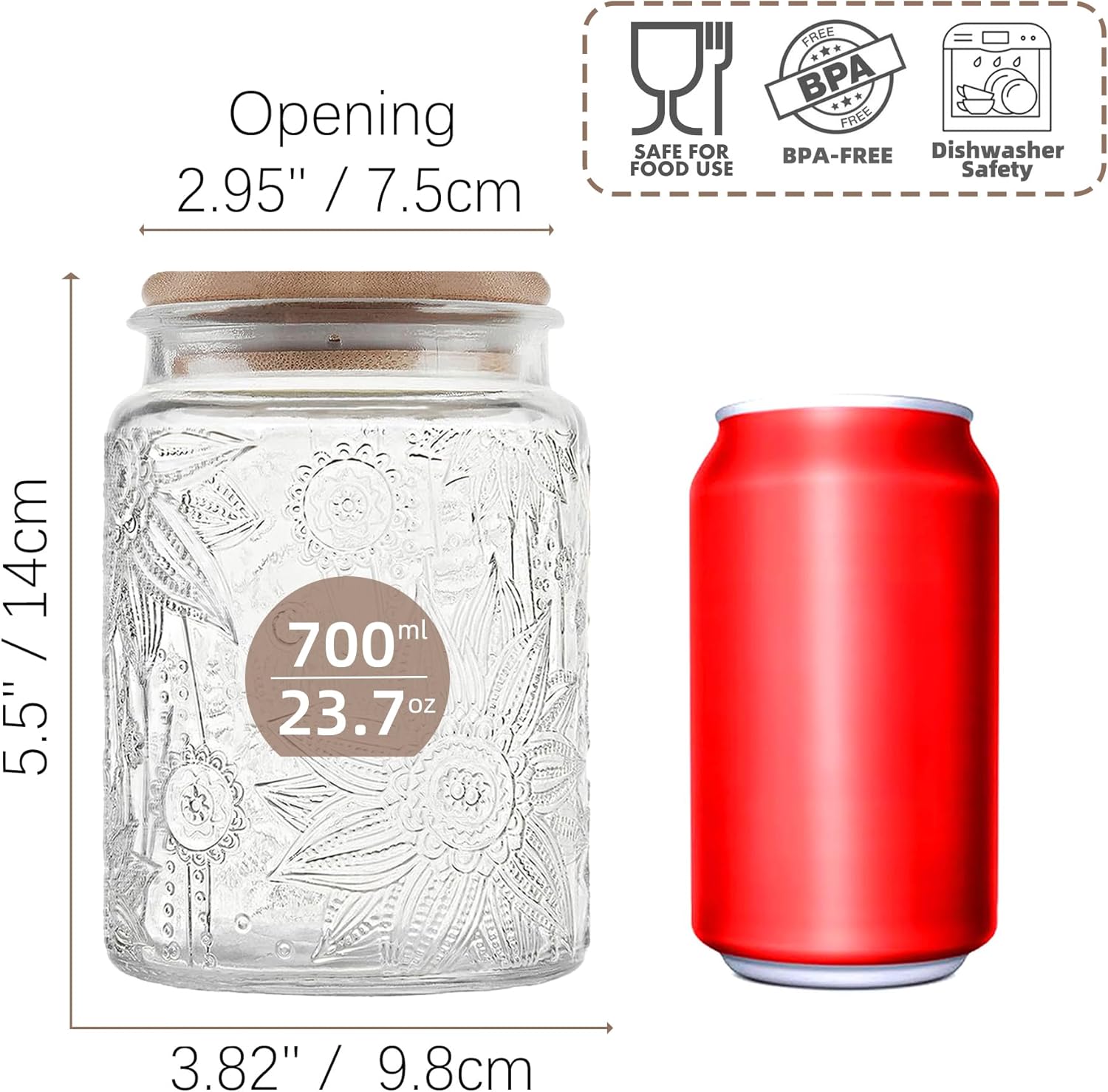 • Compact Size with Practical Capacity Measuring 5.5 x 3.82 inches (14 x 9.8 cm), the jar holds up to 23.7 fl oz (700 ml) of liquid or approximately 0.54 lbs (230 g) of coffee beans. The wide 2.95-inch (7.5 cm) opening ensures easy access and cleaning, while the total weight (with lid) is 460 g—perfect for everyday use without taking up too much space.