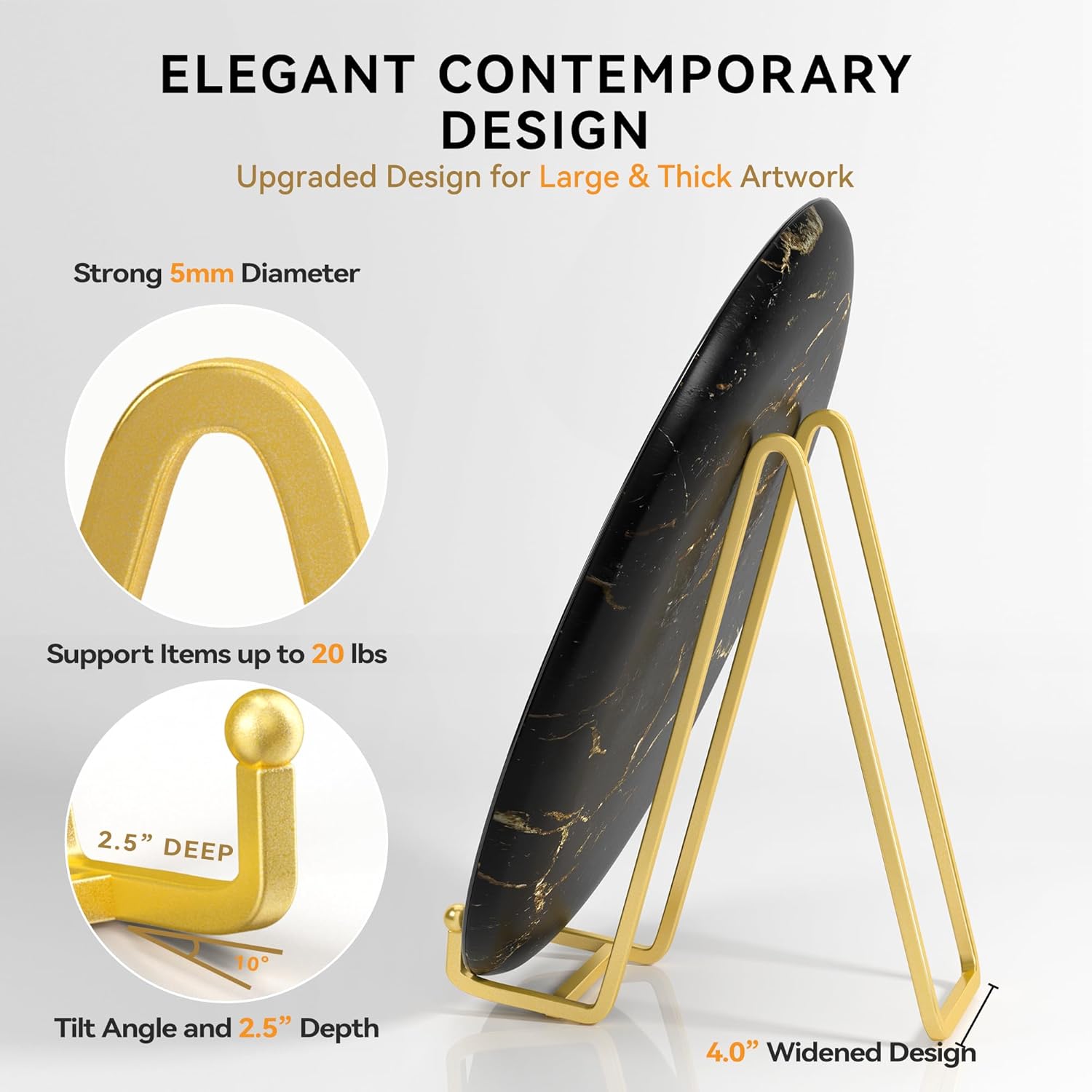• DISPLAY STAND SPECIFICATIONS: - This 10 inch plate stand features a sturdy 2.5" deep lip, a 10° tilt angle, and a 4" widened design with a 5mm square wire diameter, making it perfect for securely holding items ranging from 10" to 30" in size and up to 20 lbs in weight.