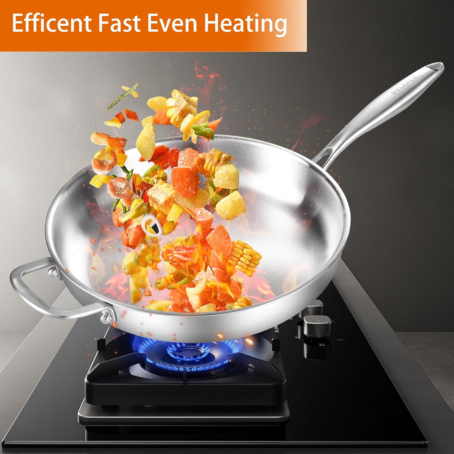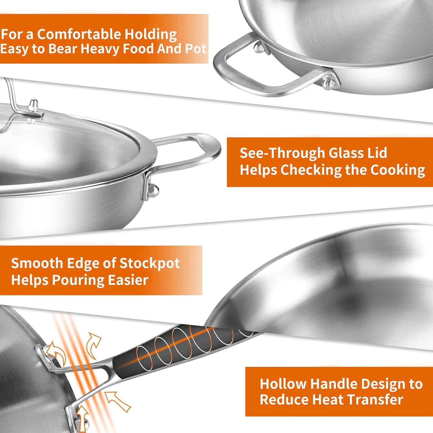 • 【Widely Applicable】 The Delarlo 100% Stainless Steel Pan Compatible with All Cooktops, Including Induction, Gas, Electric, Glass, Ceramic, And Halogen, Etc. The Fully Clad 18/10 Stainless Steel Pan is Not Only Durable and Heavy-Duty But Also Enables Its Body to Withstand a High Temperature of Up To 600°F, And The Lid Up To 300°F. It Is Suitable For Cooking Methods Such as Frying, Stir-Frying, Shallow Frying, Steaming, Baking and Searing, Delarlo Induction Cookware is Well-Suited for Both Family Kitchens and Commercial Kitchens.