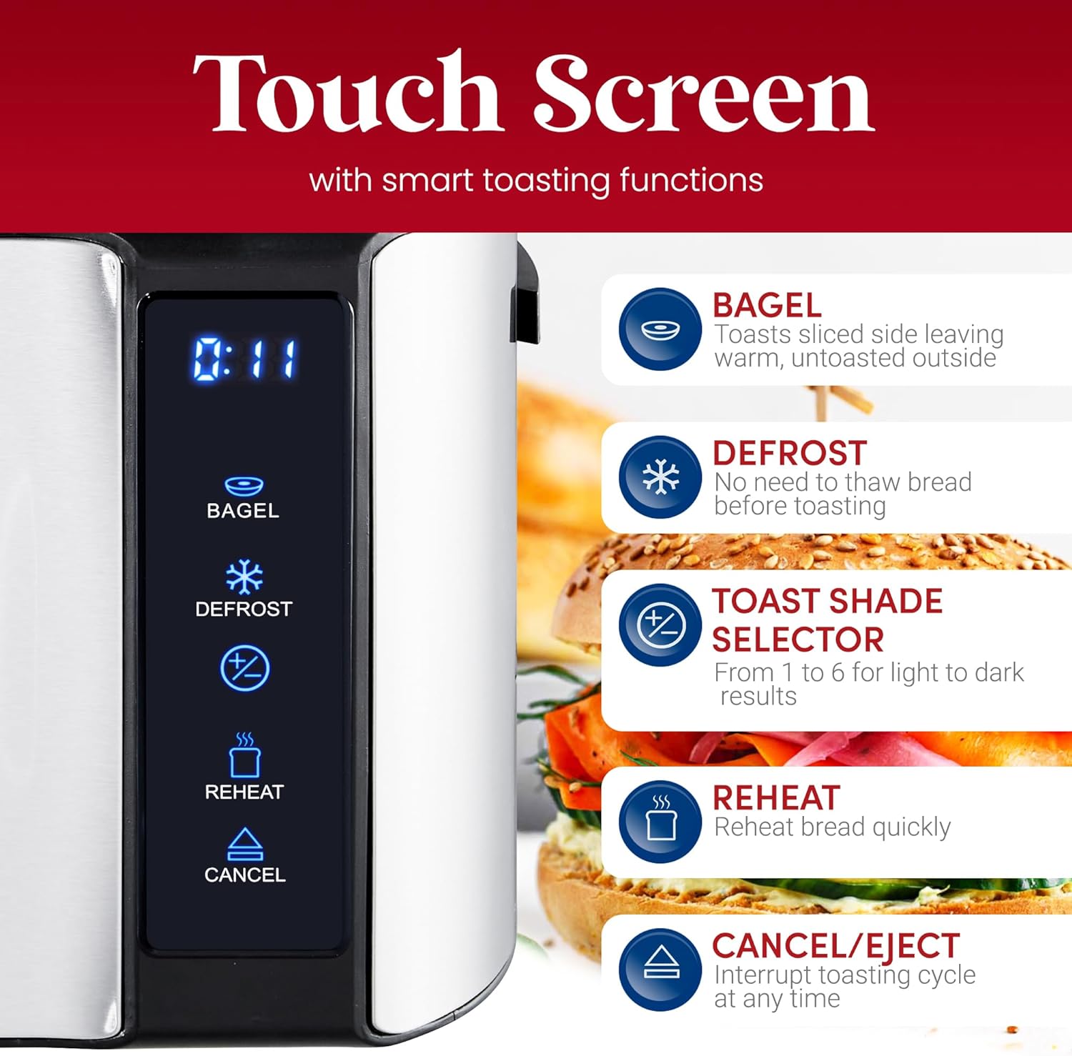 • CAPACITIVE TOUCH SCREEN WITH DEFROST & BAGEL FUNCTIONS allow you to easily defrost and toast breads quickly and conveniently toast Bagels on the inside while leaving the outside warm & soft.