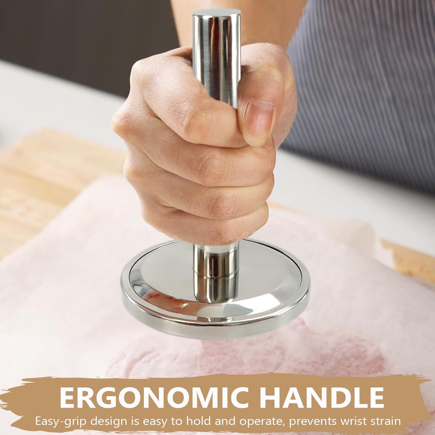 • ESSENTIAL KITCHEN TOOLS - The stainless steel meat pounder flattens all types of cutlets into a thin, even thickness for even cooking without tearing or breakage like the hammer style, enhancing flavor and ensuring shorter cooking times. Thanks to its smooth, flat disc bottom, you can also use the tool to crack or smash other foods including shellfish, nuts, crackers, hard candy, garlic and more.