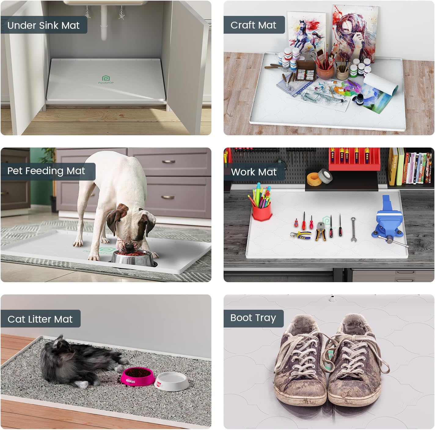 • 【Multi-Function Mat】- Under sink mat are not only for kitchen cabinets, but also for bathrooms, or utility rooms. You can use the mat as a pet feeding mat / boot tray / mini fridge drip tray / craft mat / cat litter mat and any other activity that tends to get messy.